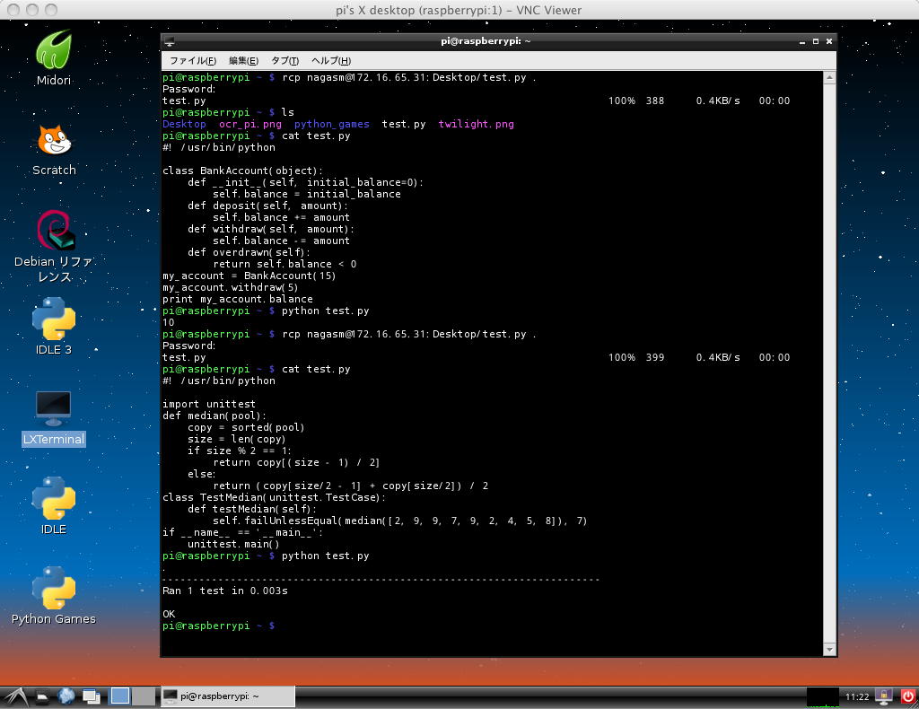 以下は「12 lines: Classes」と「13 lines: Unit testing with unittest」をそれぞれを「test.py」に書き出して、Raspberry Piからrcpでゲットして走らせた模様の、VNC経由のスクリーンショットである。 前者はdef定義のサンプル、後者はクイックソートの速度測定である。