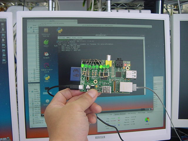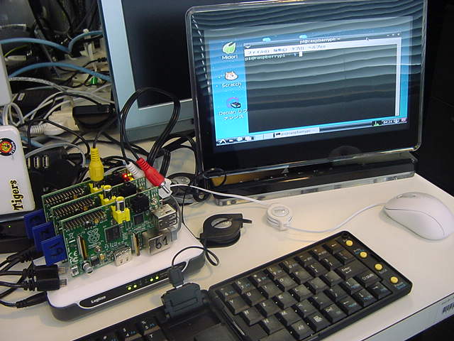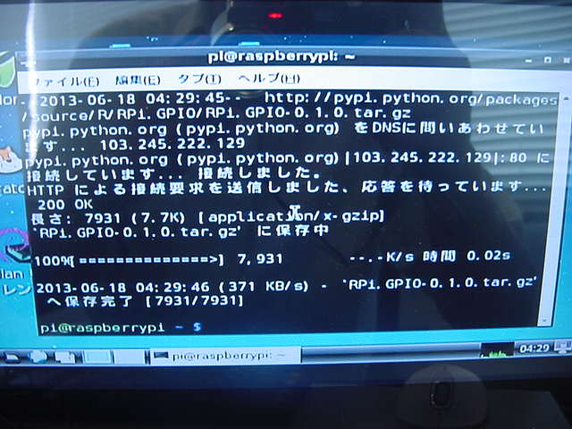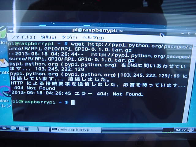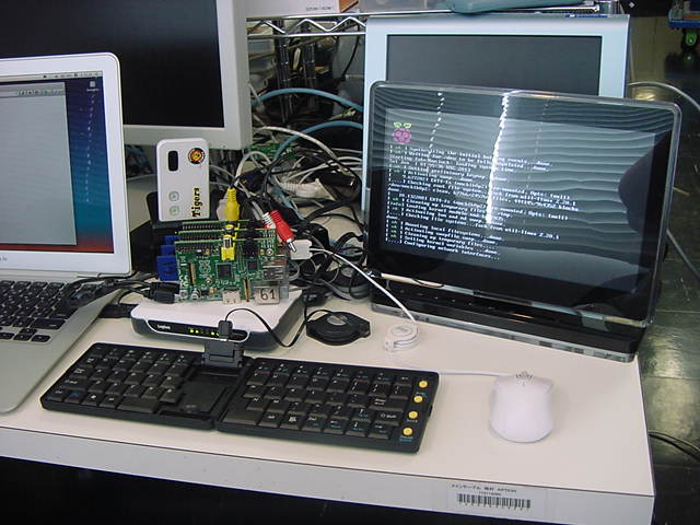 そして久しぶりに、以下のチャチいキーボードと見にくい液晶モニタの出番である(^_^;)。 何度もミスタイプを叱られながら、過去の失敗の経験から何度も「sudo apt-get update」をかましつつ、「GPIO」のゲットとインストールだけでなく、ふーみんに教わった「sudo apt-get install puredata」と「sudo apt-get install python-txosc」と「sudo apt-get install pd-osc」をエラー無しに完了させ、さらにThingmのBlibk(1)もついでにダウンロードしてみた。 経緯は こんな感じ である。