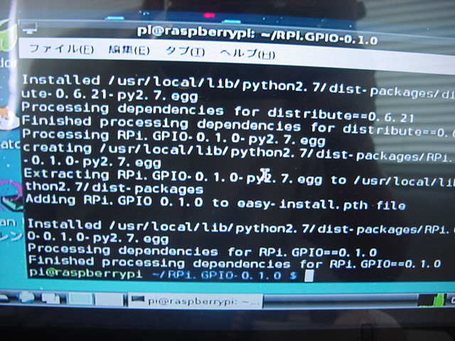 そこで、Macでダウンロードした「RPi.GPIO-0.1.0.tar.gz」をRaspberry Piの61号機にrcpして、「tar zxf RPi.GPIO-0.1.0.tar.gz」で解凍して、「cd RPi.GPIO-0.1.0」で移動して、「sudo python setup.py install」してみると、以下のような状態で止まった。 これはかつてふーみんに聞いた、SUACのプロキシサーバの情報を「export http_proxy="http://・・・」と入れても駄目だった(^_^;)。3 Installing RPi.GPIO RPi.GPIO is a small python library that take some of the complexity out of driving the GPIO pins, once install a single LED can be lit with 3 lines of python. Installing the library is almost as simple, either at a text console or using LXTerminal enter the following $ wget http://pypi.python.org/packages/source/R/RPi.GPIO/RPi.GPIO-0.1.0.tar.gz $ tar zxf RPi.GPIO-0.1.0.tar.gz $ cd RPi.GPIO-0.1.0 $ sudo python setup.py installこうなれば、久しぶりにモバイルWiFiルータの出番である。 直接にネットに繋いで、最新の「distribute-0.6.21.tar.gz」を取りに行かないといけないのだ。 さっそく61号機と62号機をシャットダウンして、 ここでやった方法 を再現して、以下のように63号機の固定IPをDHCPに変更してシャットダウンして、LANハブを研究室の学内LANからモバイルWiFiルータに繋ぎ変えた。pi@raspberrypi ~ $ ls Desktop ocr_pi.png python_games test.py twilight.png pi@raspberrypi ~ $ rcp nagasm@172.16.65.31:Desktop/RPi.GPIO-0.1.0.tar.gz . Password: RPi.GPIO-0.1.0.tar.gz 100% 7931 7.8KB/s 00:00 pi@raspberrypi ~ $ ls Desktop RPi.GPIO-0.1.0.tar.gz ocr_pi.png python_games test.py twilight.png pi@raspberrypi ~ $ tar zxf RPi.GPIO-0.1.0.tar.gz pi@raspberrypi ~ $ cd RPi.GPIO-0.1.0 pi@raspberrypi ~/RPi.GPIO-0.1.0 $ sudo python setup.py install Downloading http://pypi.python.org/packages/source/d/distribute/distribute-0.6.21.tar.gz ^Z [1]+ 停止 sudo python setup.py install pi@raspberrypi ~/RPi.GPIO-0.1.0 $