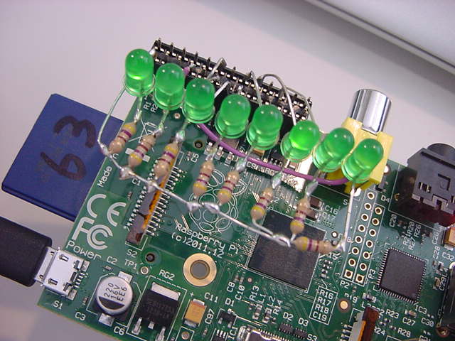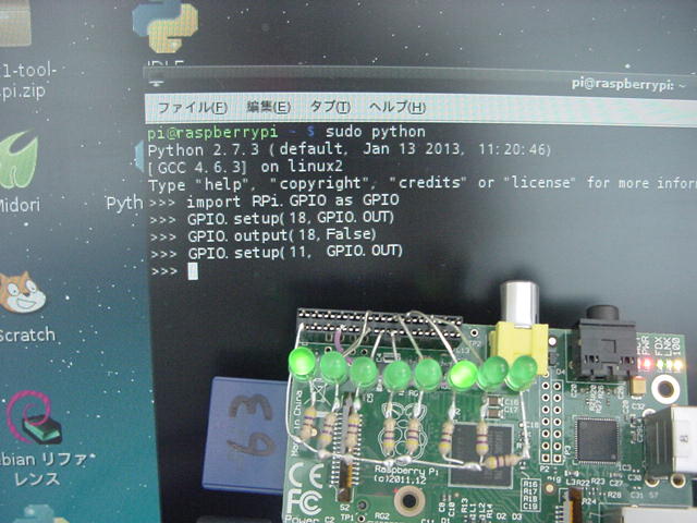 Pythonのコマンドラインから点灯させるというのもナンなので、以下のようなPythonプログラムを作ってRaspberry Piに送って、「sudo python test.py」ということで実行させると、順にLEDが点灯した。 ただし何故か、3ビット目、13ピンのLEDが点灯しなかったのが謎だが(^_^;)、まぁこれでPythonプログラムでハードを叩く、という流れは確認できた。 謎の13ピンは置いておくとして(^_^;)、今日はまずまず進展した。 ここまでで、インプレスのRaspberry Pi本も全て終わったことになる。