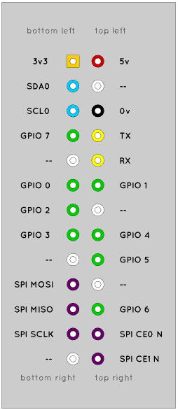 - Raspberry PiのGPIOはヘッダで出ていて、2ピンのUART、2ピンのI2C、6ピンのSPIを含むI/Oピンからなる