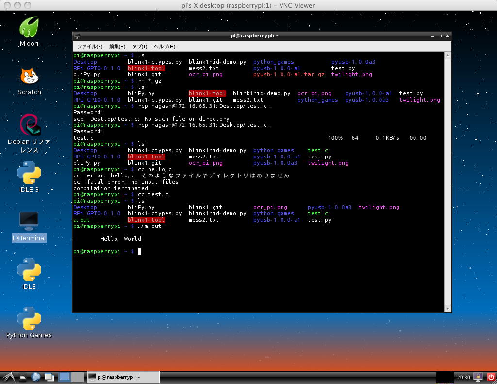 昨日の夕方に届いたブツは こんなこと が出来る、というプツである。 いずれ何かに使うかもししれない。 そして週末になったが、土曜の午前中はおいちゃんの映像(Vコン)に音楽トラック制作作業、「試作1」の作曲で終わった。 午後には(ここを書いている研究室内)、「40虎」のメンバーのうち5人が集合して、「碧風祭・メディア企画の歴史」「中学星2」の上映会があって、ついつい映像に見入って進まなかった(^_^;)。 昨日のふーみんメイルの3本目は以下であるが、たしか「git」は駄目だったので(;_;)、「Raspberry PiをC言語で」という部分を進展させた後で、「Raspberry PiのBlink(1)をC言語で」に取りかかるのが適当だろう。ということで、CQ本のC言語の解説の部分から再開である。 この「Raspberry Pi日記」の最初、 5月15日のところ で、以下のようにあった「test.c」をRaspberry Piにrcpして、コンパイルして、無事に走ることを確認した。 まぁ、Raspberry PiはUnixなので、これは当然である。(^_^;)Cのライブラリも普通に使えるようです. git clone git://github.com/todbot/blink1.git cd blink1/ cd commandline make sudo cp blink1-lib.so /usr/lib sudo cp blink1-lib.h /usr/include で,ライブラリとヘッダファイルが使えるようになります. ソースファイルのblink1-tool.c を見れば, blink1-lib の使い方は大体わかると思います. もっとも,これがなくても,/dev/hidraw0 などのデバイス名で アクセスできるので,上記の blink1/commandline/ の 下にある,blink1raw のサンプルソースのようにすれば Cからであれば直接プログラムすることも可能な気がします. cd blink1raw make sudo ./blink1raw /dev/hidraw0 :0,255,0 sudo ./blink1raw /dev/hidraw0 =255,0,0,500 これで,緑にしてから5秒で赤にする,という動作をします. blink1raw.c を見ればどういうプログラミングをすればいいかも わかります.#include <stdio.h> main(){ printf("\n\tHello, World \n\n"); }ls