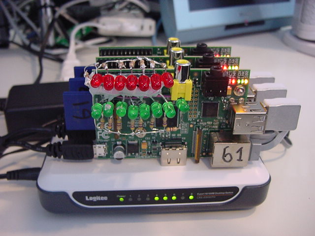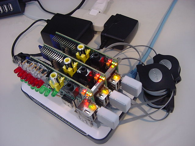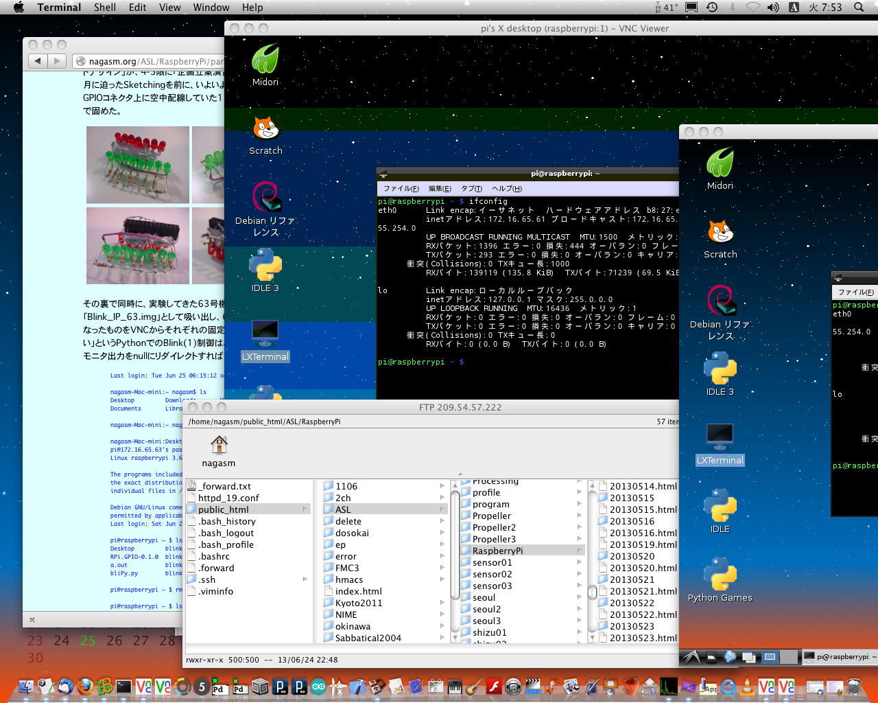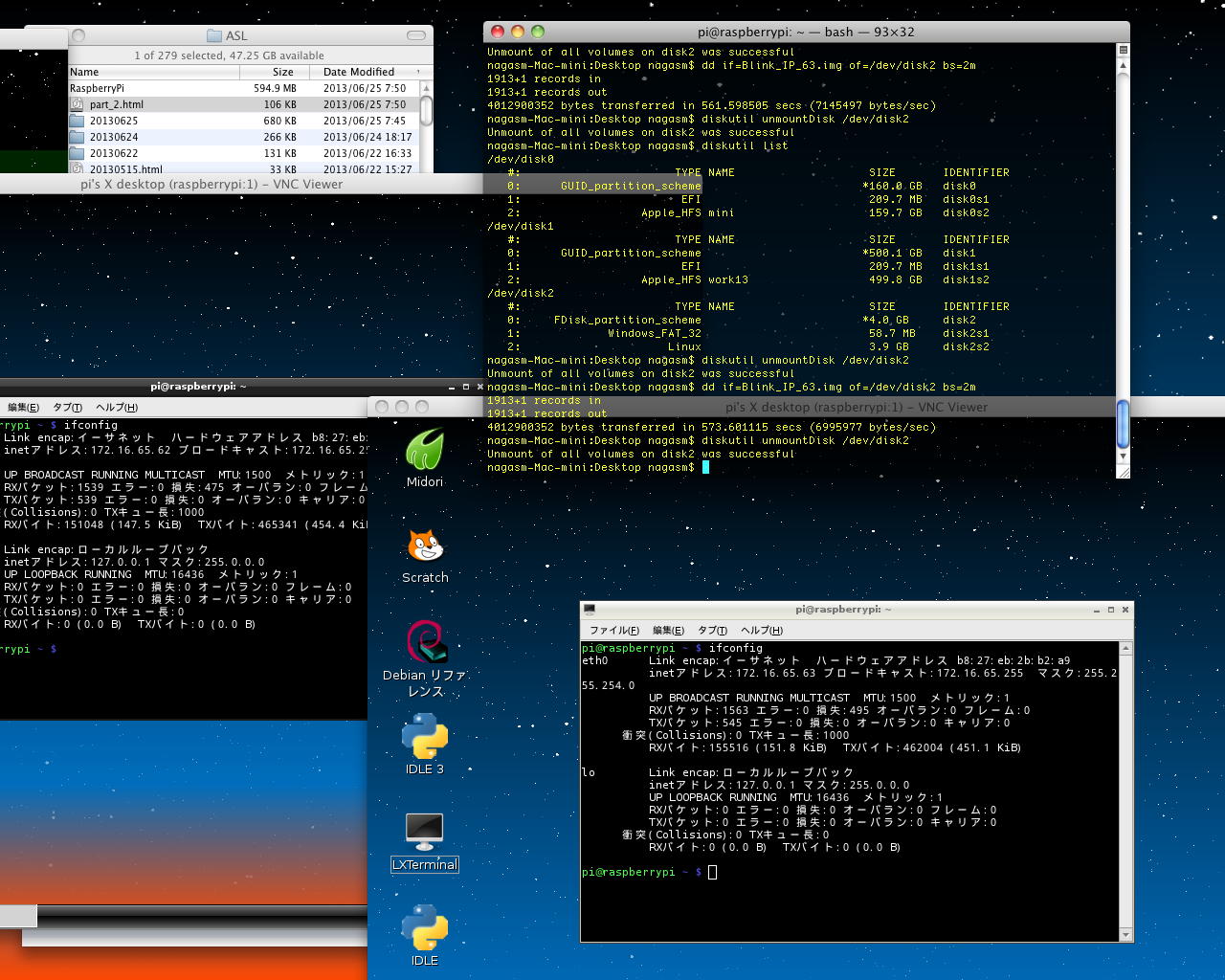そして、GPIOポートの実験のために63号機のSDカードを挿して実験してきたRaspberry Piから、以下のように、また3枚タンデムのRaspberry Piシステムに戻した。 この状態で、しばらくはプログラミングを行うことになる。Last login: Tue Jun 25 06:15:12 on console nagasm-Mac-mini:~ nagasm$ ls Desktop Downloads Movies Pictures Sites Documents Library Music Public nagasm-Mac-mini:~ nagasm$ cd Desktop nagasm-Mac-mini:Desktop nagasm$ ssh pi@172.16.65.63 pi@172.16.65.63's password: Linux raspberrypi 3.6.11+ #456 PREEMPT Mon May 20 17:42:15 BST 2013 armv6l The programs included with the Debian GNU/Linux system are free software; the exact distribution terms for each program are described in the individual files in /usr/share/doc/*/copyright. Debian GNU/Linux comes with ABSOLUTELY NO WARRANTY, to the extent permitted by applicable law. Last login: Sat Jun 22 05:30:39 2013 pi@raspberrypi ~ $ ls Desktop blink1-ctypes.py mess2.txt pyusb-1.0.0a3 RPi.GPIO-0.1.0 blink1-tool ocr_pi.png test.c a.out blink1.git python_games test.py bliPy.py blink1hid-demo.py pyusb-1.0.0-a1 twilight.png pi@raspberrypi ~ $ rm mess2.txt pi@raspberrypi ~ $ ls Desktop bliPy.py blink1.git python_games test.c RPi.GPIO-0.1.0 blink1-ctypes.py blink1hid-demo.py pyusb-1.0.0-a1 test.py a.out blink1-tool ocr_pi.png pyusb-1.0.0a3 twilight.png pi@raspberrypi ~ $ ls *.py bliPy.py blink1-ctypes.py blink1hid-demo.py test.py pi@raspberrypi ~ $ rm *.py pi@raspberrypi ~ $ ls Desktop a.out blink1.git python_games pyusb-1.0.0a3 twilight.png RPi.GPIO-0.1.0 blink1-tool ocr_pi.png pyusb-1.0.0-a1 test.c pi@raspberrypi ~ $ sudo ./blink1-tool -t 2000 --random 100 random 100 times: 0: 0/1 : f4,4b,4b 1: 0/1 : 10,e3,9a 2: 0/1 : f5,af,be 3: 0/1 : 36,1e,7c 4: 0/1 : c5,dd,a5 5: 0/1 : f3,e5,19 6: 0/1 : a3,f5,bb 7: 0/1 : d2,45,24 ^Z [1]+ 停止 sudo ./blink1-tool -t 2000 --random 100 pi@raspberrypi ~ $ sudo ./blink1-tool -t 2000 --random 10 > null pi@raspberrypi ~ $ ls Desktop a.out blink1.git ocr_pi.png pyusb-1.0.0-a1 test.c RPi.GPIO-0.1.0 blink1-tool null python_games pyusb-1.0.0a3 twilight.png pi@raspberrypi ~ $ sudo halt Broadcast message from root@raspberrypi (pts/0) (Sat Jun 22 05:37:37 2013): The system is going down for system halt NOW! pi@raspberrypi ~ $ Connection to 172.16.65.63 closed by remote host. Connection to 172.16.65.63 closed. nagasm-Mac-mini:Desktop nagasm$