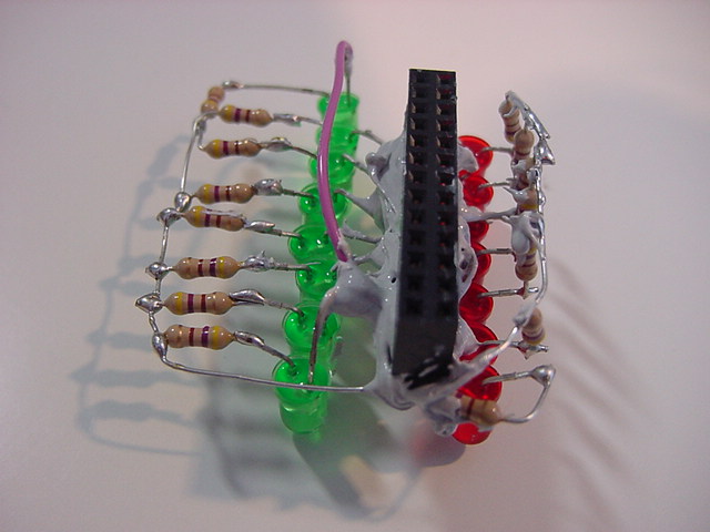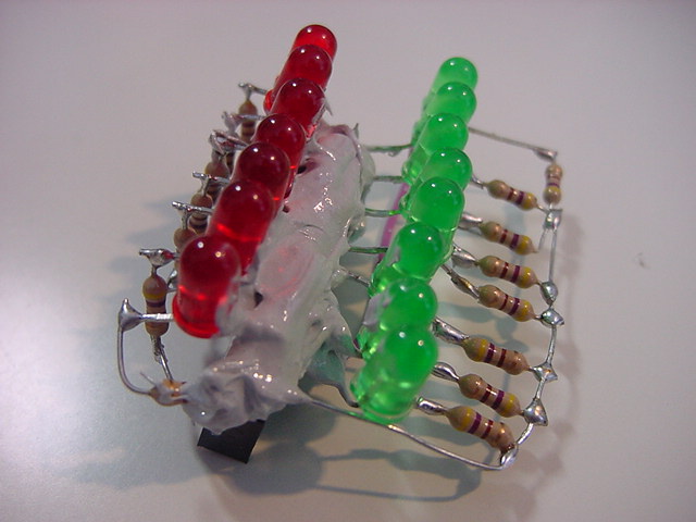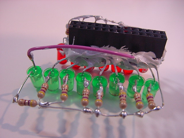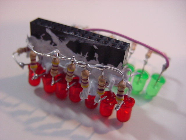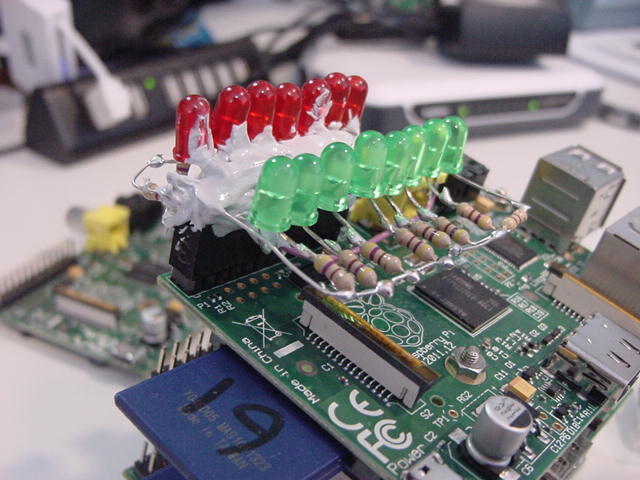 このところ早起きが快調に続いている。 昨日も今日も、朝06:15にはもう研究室で仕事開始である。 1限に「サウンドデザイン」が、4-5限に「企画立案演習」があるが、Raspberry Pi関係でもやりたい事がどんどん浮かんできて、来月に迫ったSketchingを前に、いよいよ佳境なのである(^_^)。 まずは朝イチで、以下のように、Raspberry PiのGPIOコネクタ上に空中配線していた15個のLEDの根元を、接触とか断線とかしないように、硬化型の充填接着剤で固めた。