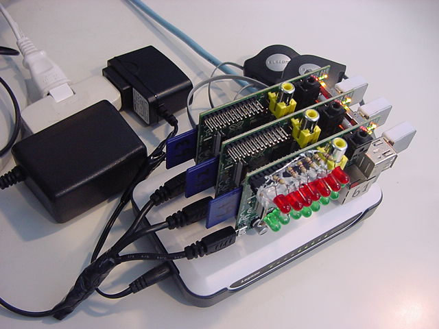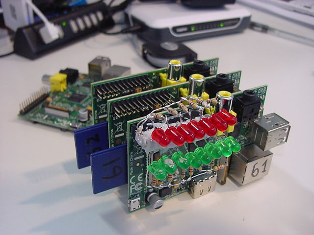 これをRaspberry Piに転送して、「cc test.c -o blink_autorun」としてカレントディレクトリに置いた。 この「./blink_autorun」が動くことを確認して、次に6月3日に行った手順に従って、以下のように続けた。#include <stdio.h> int main() { while (1) { system("./blink1-tool -t 1000 --random 100 > null"); } }ちなみに、せっかくなので61号機では1000msecだった変化間隔を、62号機では800msecに、63号機では700msecにしてみた(^_^;)。 これでそれぞれを再起動すると、以下のように見事に、3台のRaspberry Piがカラフルな自動発光をするようになった。 なお、このプロセスを止めるには「ps ax」してPIDを捜して、例えばPIDが2201であれば「kill -9 2201」で止まる。 これを改めて起動したい場合には「./blink_autorun」とするとコマンドラインに戻らないので、「./blink_autorun &」とすれば、バックグラウントで起動するのでコマンドラインに戻る。