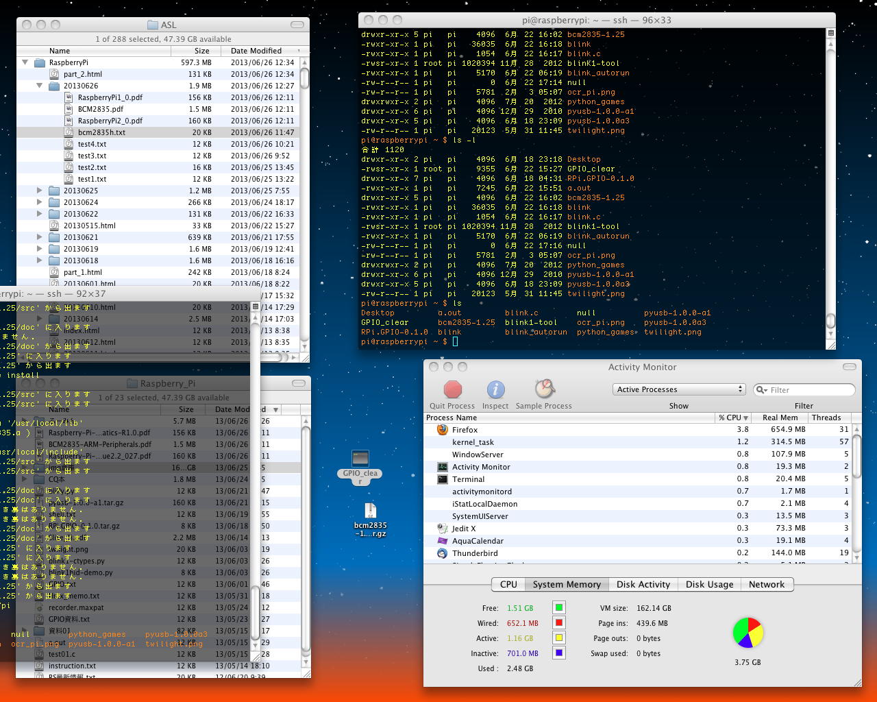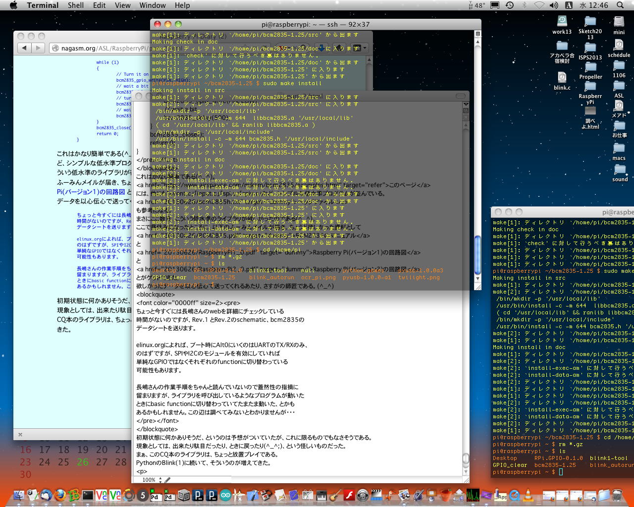 さて水曜日である。 講義の無いこの日は、放課後のアカペラまでがっつり進める日である。 昨日の帰り際に、「昨日走ったソフトが何故か今日走らない」という情けないメイルをふーみんに出していたが、今朝読んだ返信は以下であり、まさにもっともであった(^_^;)。 ちゃんとふーみんはピン番号の新旧についても記述していたが、僕が読み落としていた。 今日はまず、ヘンな省略をしないところから再開し、紹介された情報をチェックしていこう。CQのRaspberry Pi本の第5章の「デバイスドライバを使う」のところに書かれていた「省略可能」という記述を並べると以下のようになる。 OSが別途に管理してくれているので、まぁ、動くよ、という事なのだが、ここは基本に戻って、しっかりと形式を整えることにしよう。http://netlog.jpn.org/r271-635/2013/01/raspberry_pi_gpio_test.html あたりをみて, http://www.open.com.au/mikem/bcm2835/ のライブラリを使った方が楽ではないかと・・・. # *_close()を省略しても大丈夫,という記述はちょっと信じられません. ちなみにRevisionによるピンアサインの差異は私の本でも 見分け方とともに説明してあります.・・・ということで、Raspberry Piを立ち上げ、VNCだとコピペが出来ないのでsshでRaspberry Piに入り、まずは昨日の現象を確認した。 リセット直後のRaspberry Piで再現確認しておく事は意味があるだろう。 まず、再掲になるが、拡張7ビットに対してコマンドラインから表示を指令したシェルスクリプトの test1.c をrcpすると、以下のようにこれは自動的に実行可能と表示され、sudoで実行してLEDが順に点灯した。