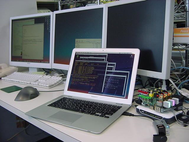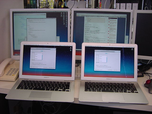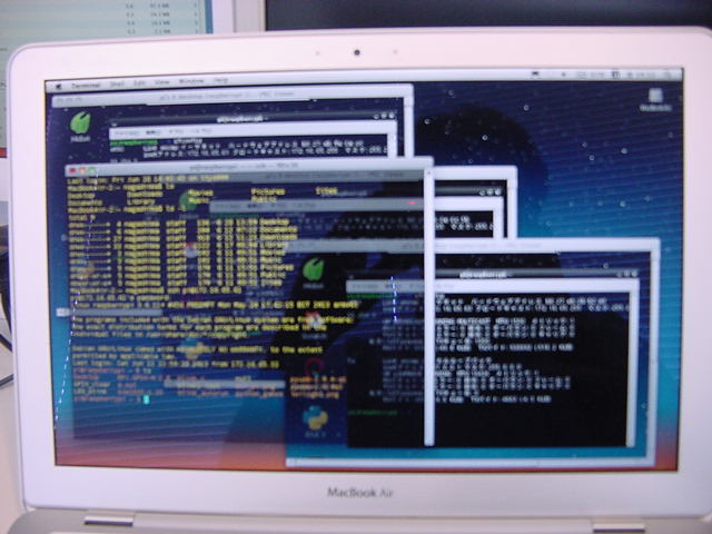 このネットワーク接続確認作業そのものは順調に出来たのだが、ここで驚くべき現象に遭遇した。 これまで世界各地/国内各地を一緒に出張してきた、MacBookAirの1号機の方が、突然に画面が真っ暗になったのである。 ただし「落ちた」のではなくて、よく見るとバックライトを最低にした時のように、画面内にうっすらと何か出ている時もあり、また完全に真っ暗になる時もある。 PRAMリセットでも戻らず、リセットとかスリープとかの反応から、落ちるのではなくてバックライトがゼロになる現象のように見えた。 USBに接続しているLANアダプタのLEDは点灯しているので、パソコン本体は生きているのだ。 サブモニタに出すVGAアダプタを差し込むとスパッと画面が出た(バックライト正常復帰)現象もヒントになりそうである。