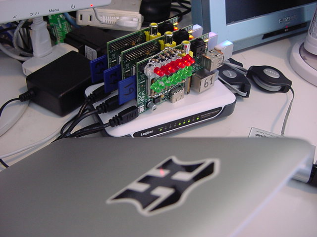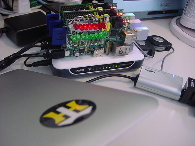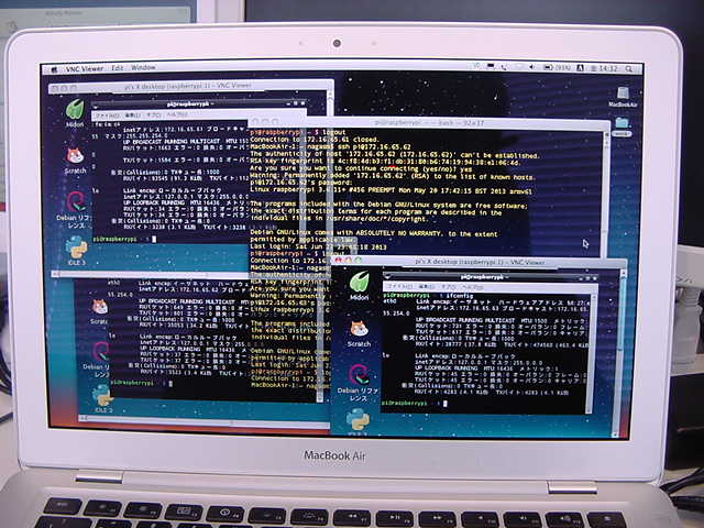 ここで2限にゼミがあり、3人の進捗確認や関連映像などで勉強した。 そして午後には、「企画立案演習」でコマ撮りアニメに初挑戦というグループを支援して、久しぶりにFinalCutProで静止画を連結して映像化し、サウンドトラックを仕込む、というデモを行った。 サンプルとして、デスメタル版の「トトロ」→「ポニョ」というメドレーのシュールな映像が出来たのだが、YouTubeに叱られるので残念ながらここには上げられない(^_^;)。 そしてこの4限を挟んで、以下のように研究室LANからLANハブを切り離して、2台となったMacBookAirそれぞれをホストとして、3台のRaspberry Piがネットワーク接続され、MacからsshとかVNCでそれぞれのRaspberry Piに接続できる確認を行った。