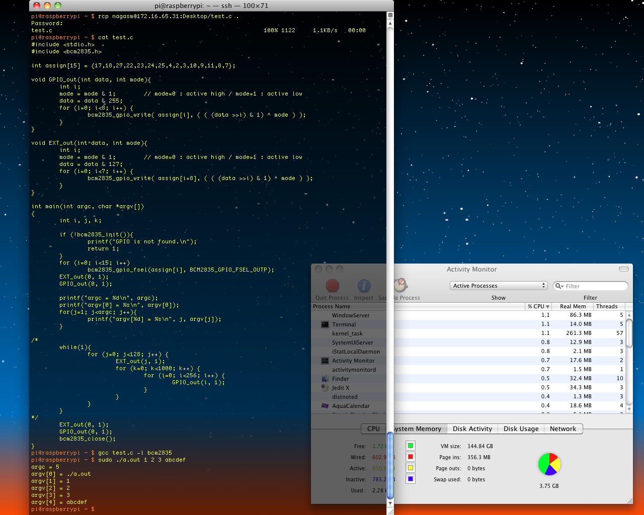 もう週末である。 明日の日曜日の午前には、SUACのプロキシサーバ交換工事が予告されていて仕事に出て来れない(;_;)が、その分、この土曜日の予定は満載である。 バスで大学に出て来て、午後には「40虎」のミーティングがあり、今日は予約しておいた講堂とギャラリーの探検である。 その後、某秘蔵映像の上映会(勉強会)があり、晩にはお楽しみの予定もある(のでクルマでなくバスで来た(^_^;))。 そのバス車内でRaspberry Piで次に実験してみたい事も浮かんできていて、午前中ガシガシ進めよう、と思っていたところにSOS連絡があり、急遽タクシーを大学に呼んで、自宅に行ってスグまた大学に戻ってきたりして時間を取られたが、 可愛いこの子 のためだ、仕方ない。(^_^;)さてRaspberry Piでの実験であるが、C言語で゛GPIOポートをアクセスするプログラムが出来る、と判ったので、その部分ではPythonのGPIOアクセスはパスする事にしたが、せっかく高機能なRaspberry Piなので、あれこれ他の仕事も同時に(時分割多重化)行うためには、やはり標準推奨環境であるPythonは必要だ、という当たり前の事に気付いたのがスタートラインである。 すっかり油断して、もうぼちぼちPythonは忘却の彼方に行きかけていたが、ふーみん本の残された勉強項目などは、ほとんどPythonベースのアプローチなのだった。 そこでまず、残っていた「blink.c」をベースに、以下のような「test.c」を作って、まずは「コマンドラインとのインターフェース」という、C言語の標準入出力「stdio.h」の復習から始めることにした。「stdlib.h」と「fcntl.h」は、ファイルアクセス等で必要だ、とエラーが出たら追加することにした。