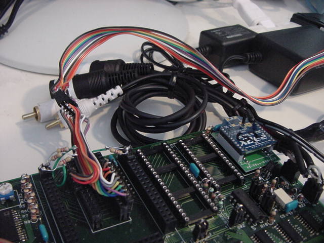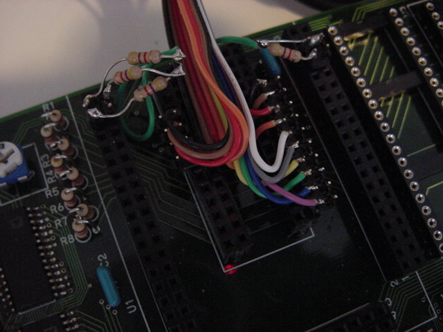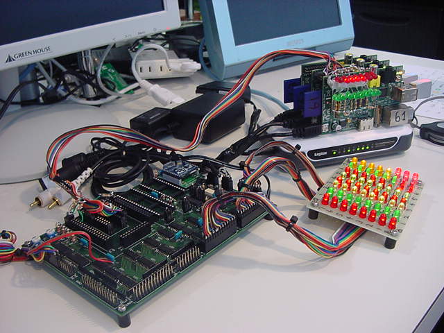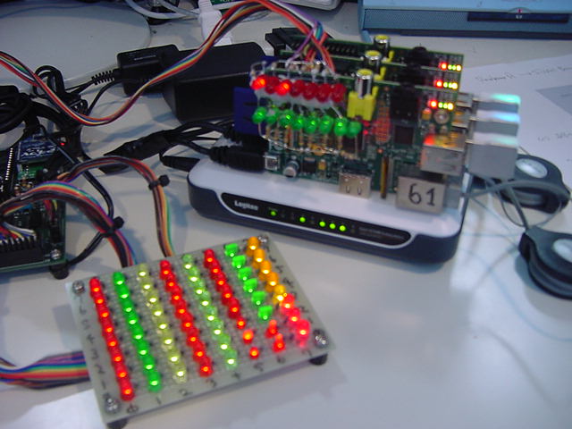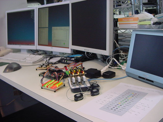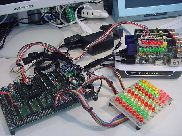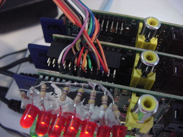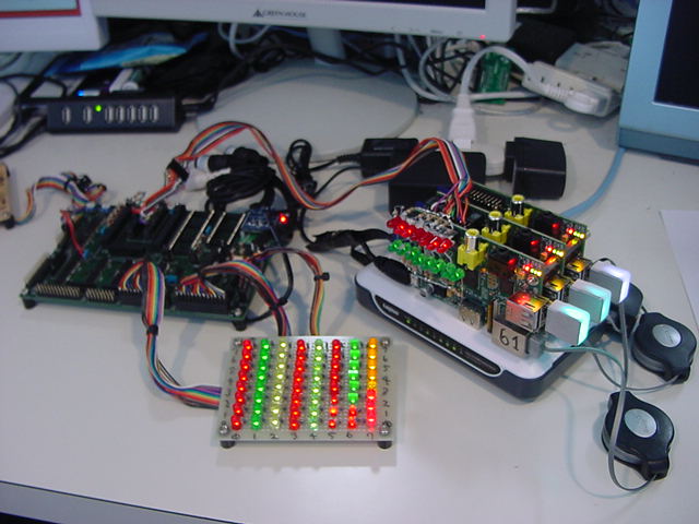 SUACboardの入出力バスラインはPropellerに直結できる3.3Vレベルと設計していて、5V系のデバイスはCMOSのスレショルド(2.5V)以上として3.3Vレベルに対応し、5V系の入力デバイスのバスラインからはビットごとに1kΩの抵抗を入れている。 これにより、3.3V系であるRaspberry Piとは、そのまま接続できることになる。 目標はもちろん、Raspberry Piでも64個のLEDの個別PWM制御であるが、まずはラッチにデジタルデータを書き込んでの表示からである。 Raspberry PiとSUACboardの接続の仕様は以下である。