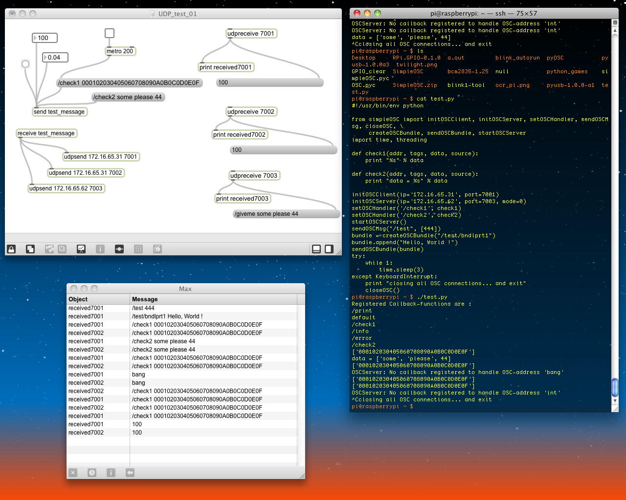 そこで、昨日の手順と同様に、以下のように SimpleOSC_0.3.2.zip を「SimpleOSC.zip」とリネームしてRaspberry Pi62号機にrcpしてunzipしてインストールしてみた。 これで、指定されたように「pyOSCをインストールした後に」「SimpleOSCインストールした」という事になった。#!/usr/bin/env python from simpleOSC import initOSCClient, initOSCServer, setOSCHandler, sendOSCMsg, closeOSC, \ createOSCBundle, sendOSCBundle, startOSCServer def myTest(): import time # in this example we will have a small delay in the while loop initOSCClient() # takes args : ip, port initOSCServer() # takes args : ip, port, mode --> 0 for basic server, 1 for threading server, 2 for forking server # bind addresses to functions setOSCHandler('/check', checkcheckcheck) startOSCServer() # and now set it into action print 'ready to receive and send osc messages ...' try: while 1: sendOSCMsg("/test", [444]) # !! it sends by default to localhost ip "127.0.0.1" and port 9000 # create and send a bundle bundle = createOSCBundle("/test/bndlprt1") bundle.append(666) # 1st message appent to bundle bundle.append("the number of the beast") # 2nd message appent to bundle sendOSCBundle(bundle) # !! it sends by default to localhost ip "127.0.0.1" and port 9000 time.sleep(0.5) # you don't need this, but otherwise we're sending as fast as possible. except KeyboardInterrupt: print "closing all OSC connections... and exit" closeOSC() # finally close the connection before exiting or program. def checkcheckcheck(addr, tags, data, source): print "CHECK CHECK CHECK..." print "received new osc msg from %s" % getUrlStr(source) print "with addr : %s" % addr print "typetags :%s" % tags print "the actual data is : %s" % data if __name__ == '__main__': myTest()ここで改めて「Simple OSC」内の「simpleOSC.py」を見ると、「basic_send.py」や「basic_receive.py」に比べてdefineばかり・・・と思ったが、関係ないことは無くて、まずはここから実験すべき、と思えた。 昨日の夕方にあれこれ悩んで調べたことで、少しは視界が開けてきたようで、無駄でもなかったのかもしれない。 そこで「simpleOSC.py」を「test.py」とリネームして、少しずつ関係なさそうなところを削ってテストランさせる、という実験を進めている中で、遂に「判って」しまった(^o^)。 「simpleOSC.py」をリネームした「test.py」では、何も起きないのである。 そして、見落としていた「app_example.py」をリネームした「test.py」で実験していて、突然に気付いたのである。 「app_example.py」の冒頭のLast login: Sat Jul 6 08:52:29 on console nagasm-Mac-mini:~ nagasm$ ssh pi@172.16.65.62 pi@172.16.65.62's password: Linux raspberrypi 3.6.11+ #456 PREEMPT Mon May 20 17:42:15 BST 2013 armv6l The programs included with the Debian GNU/Linux system are free software; the exact distribution terms for each program are described in the individual files in /usr/share/doc/*/copyright. Debian GNU/Linux comes with ABSOLUTELY NO WARRANTY, to the extent permitted by applicable law. Last login: Sun Jun 23 21:27:04 2013 pi@raspberrypi ~ $ ls Desktop a.out blink_autorun pyOSC pyusb-1.0.0a3 test.py GPIO_clear bcm2835-1.25 null python_games test test1.py RPi.GPIO-0.1.0 blink1-tool ocr_pi.png pyusb-1.0.0-a1 test.c twilight.png pi@raspberrypi ~ $ rcp nagasm@172.16.65.31:Desktop/SimpleOSC.zip . Password: SimpleOSC.zip 100% 7355 7.2KB/s 00:00 pi@raspberrypi ~ $ unzip SimpleOSC.zip Archive: SimpleOSC.zip creating: SimpleOSC/ inflating: SimpleOSC/app_example.py creating: __MACOSX/ creating: __MACOSX/SimpleOSC/ inflating: __MACOSX/SimpleOSC/._app_example.py inflating: SimpleOSC/readme.txt inflating: SimpleOSC/setup.py inflating: __MACOSX/SimpleOSC/._setup.py inflating: SimpleOSC/simpleOSC.py inflating: __MACOSX/SimpleOSC/._simpleOSC.py inflating: __MACOSX/._SimpleOSC pi@raspberrypi ~ $ rm -r __MACOSX pi@raspberrypi ~ $ cd SimpleOSC pi@raspberrypi ~/SimpleOSC $ ls -l 合計 20 -rw-rw-r-- 1 pi pi 3097 12月 13 2012 app_example.py -rw-rw-r-- 1 pi pi 4153 12月 13 2012 readme.txt -rw-rw-r-- 1 pi pi 588 11月 29 2012 setup.py -rw-rw-r-- 1 pi pi 3292 12月 13 2012 simpleOSC.py pi@raspberrypi ~/SimpleOSC $ sudo python setup.py install running install running build running build_py creating build creating build/lib.linux-armv6l-2.7 copying simpleOSC.py -> build/lib.linux-armv6l-2.7 running install_lib copying build/lib.linux-armv6l-2.7/simpleOSC.py -> /usr/local/lib/python2.7/dist-packages byte-compiling /usr/local/lib/python2.7/dist-packages/simpleOSC.py to simpleOSC.pyc running install_egg_info Writing /usr/local/lib/python2.7/dist-packages/SimpleOSC-0.3.egg-info pi@raspberrypi ~/SimpleOSC $の意味が判って、そこからイモヅル式に全ての繋がりが判ったのである。 defaultのpathとかの詳しいところは不明だが、上の「from simpleOSC import」というのは、インストールされた「simpleOSC.py」に並んでいる定義をインクルード(import)する、という事だったのだ。 そして参照されている「simpleOSC.py」の冒頭ではfrom simpleOSC import initOSCClient, initOSCServer, setOSCHandler, sendOSCMsg, closeOSC, \ createOSCBundle, sendOSCBundle, startOSCServerとあった。これが、先にインストールしておくべき、という事だったpyOSCの中にあった「OSC.py」なのである。 そして参照されている「OSC.py」の冒頭ではfrom OSC import OSCServer, ThreadingOSCServer, ForkingOSCServer, OSCClient, OSCMessage, OSCBundleとあった。 おそらくこれは、apt-getでインストール完了していたOSCのパッケージで定義されているのだろう。 これにより、結局のところ、defaultでpathとかの折り合いは済んでいる模様で(^_^;)、「app_example.py」をリネームした以下の「test.py」は、ち