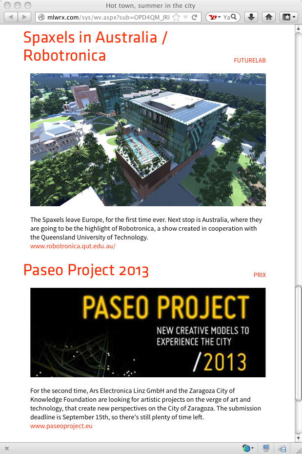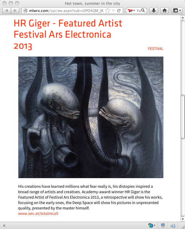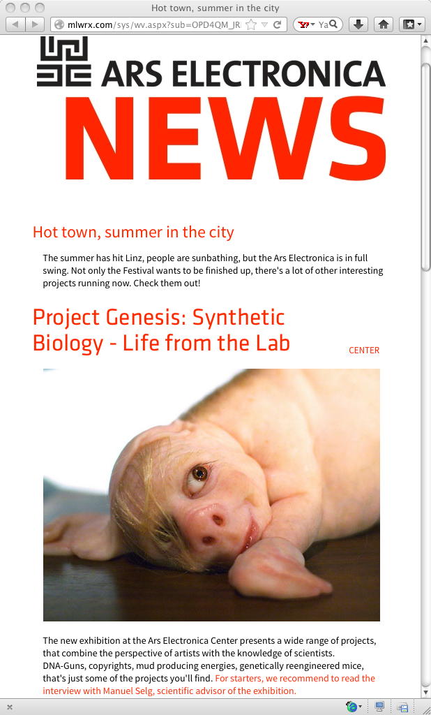 そして上のように、アルスエレクトロニカから今年のフェスティバルに関するニュースが届いた。 いつものようにアレ系のいかにもな画像(^_^;)であるが、「生命を合成する」という、なかなかエキセントリックなテーマである。 今年の欧州ツアーの最後にはアルスエレクトロニカにも行くので、ここも要チェックである。