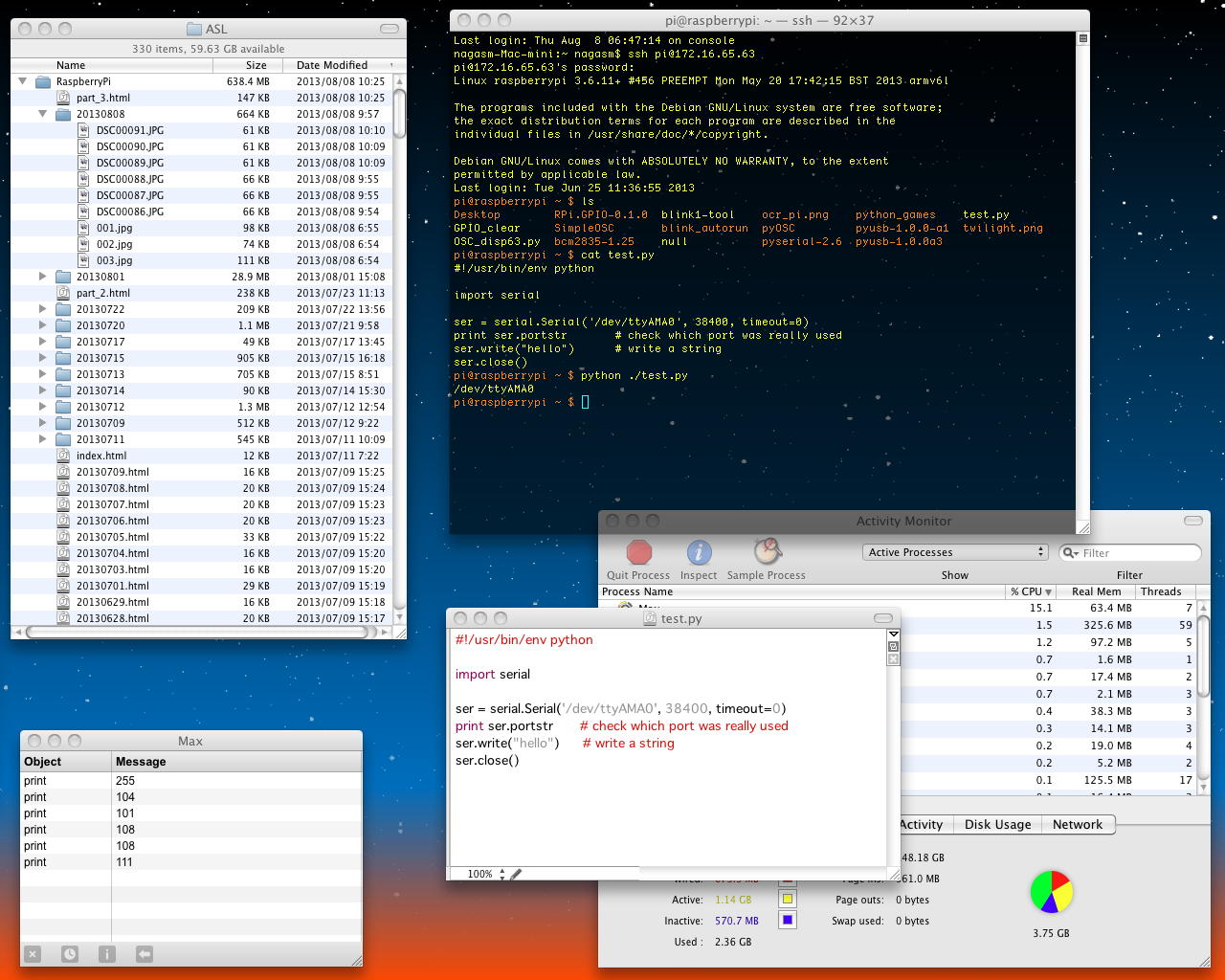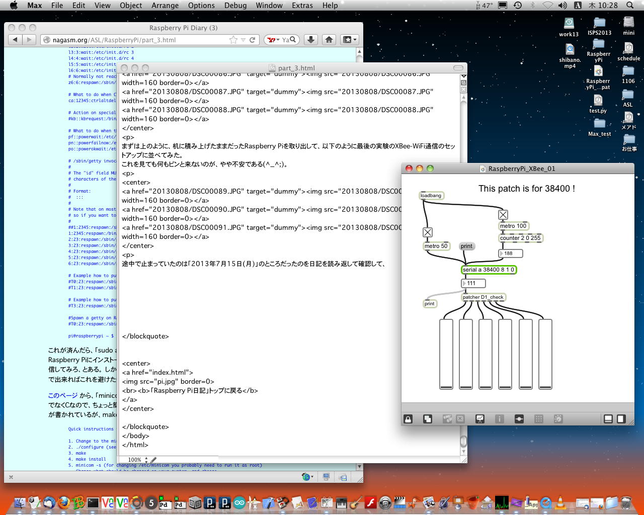 途中で止まっていたのは「2013年7月15日(月)」のところだったのを日記を読み返して確認して、メインMacのデスクトップに実験中だった 「RaspberryPi_XBee_01.maxpat」と「test.py」 がある事を確認して、Raspberry Piの63号機にsshして「python ./test.py」を実行してみると、無事にMaxパッチのMaxウインドウに、「先頭に255」「その後の5文字が"hello"」という受信データが表示された。 これで、宿題だったハード障害の可能性は否定されて、ソフトから引き続きやっていける、と確認できた(^_^)。
