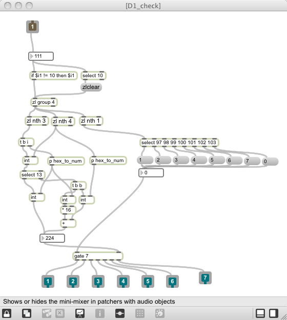 この状態では、MaxのパッチはずっとXBeeのシリアルポートを叩いてモニタ(ポーリング)しているのに対して、Raspberry PiのPythonプログラムは1メッセージを送ったらもうオシマイになっている。 やはり、リアルタイムに双方向通信するシステムを構築しておきたいので、Maxから刻々とバリューを送って、それをRaspberry Piが返すのをMaxで確認する、という事になるだろう。 この実験に使っていたMaxパッチ「RaspberryPi_XBee_01.maxpat」の以下のサブパッチは、Propeller-OLEDで定義したプロトコルのためのもので、実はまだここでは稼働しておらず、Maxウインドウにはシリアル入力がそのままモニタされている。 つまり、MaxとRaspberry Piの両方から、このプロトコルを改めて定義する必要もある。