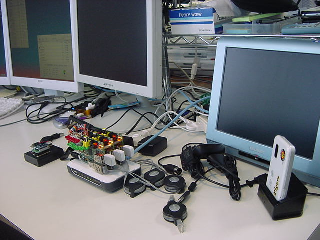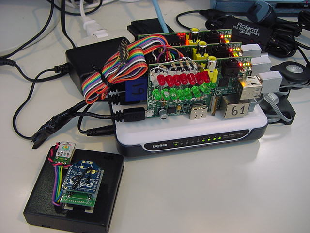 まずは上のように、机に積み上げたままだったRaspberry Piを取り出して、以下のように最後の実験のXBee-WiFi通信のセットアップに並べてみた。 これを見ても何もピンと来ないのが、やや不安である(^_^;)。