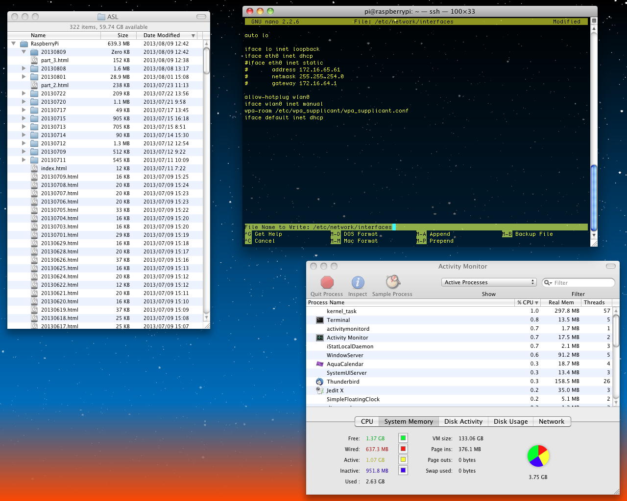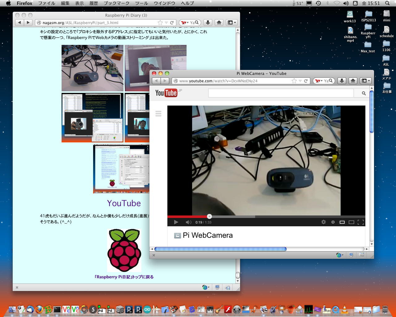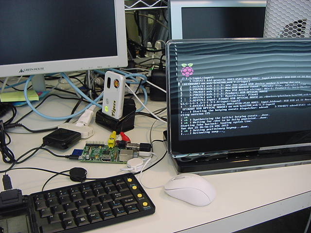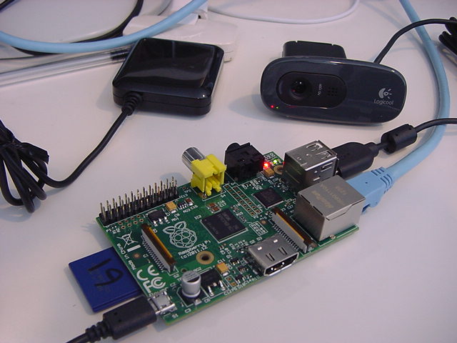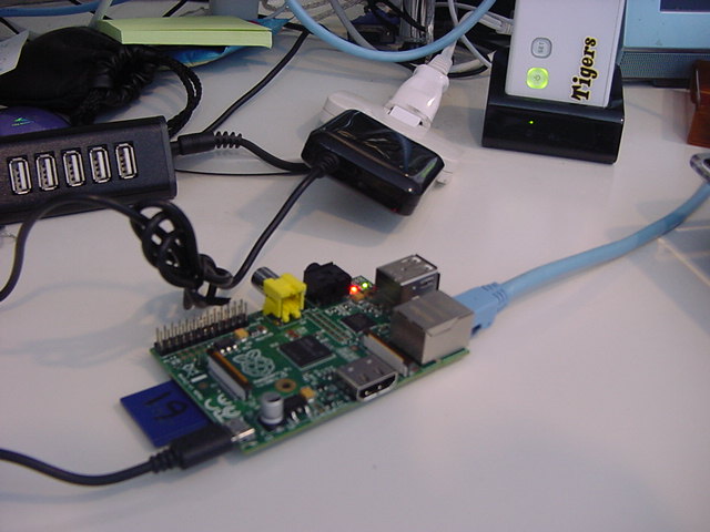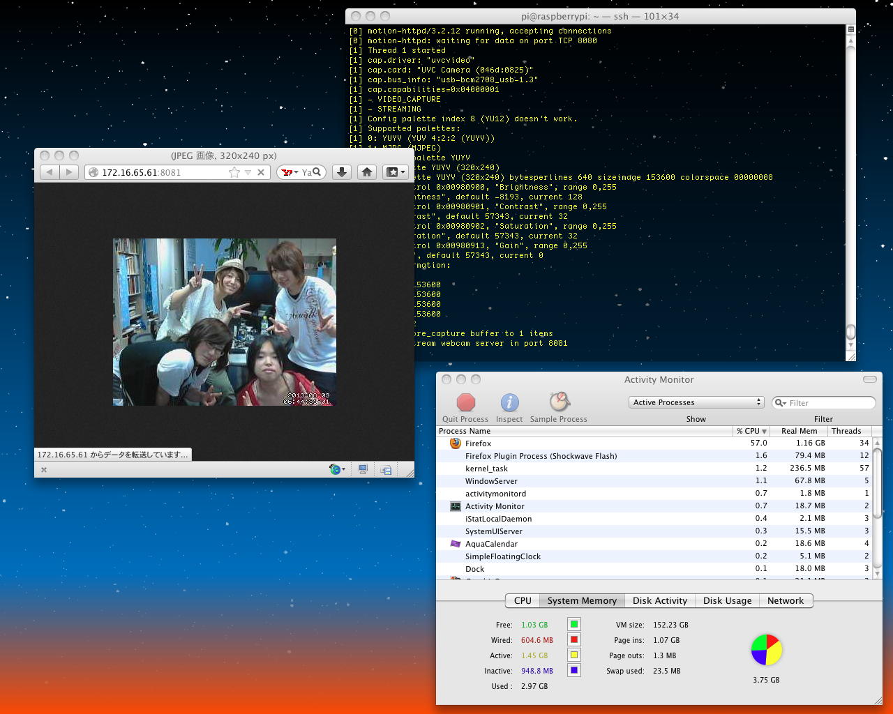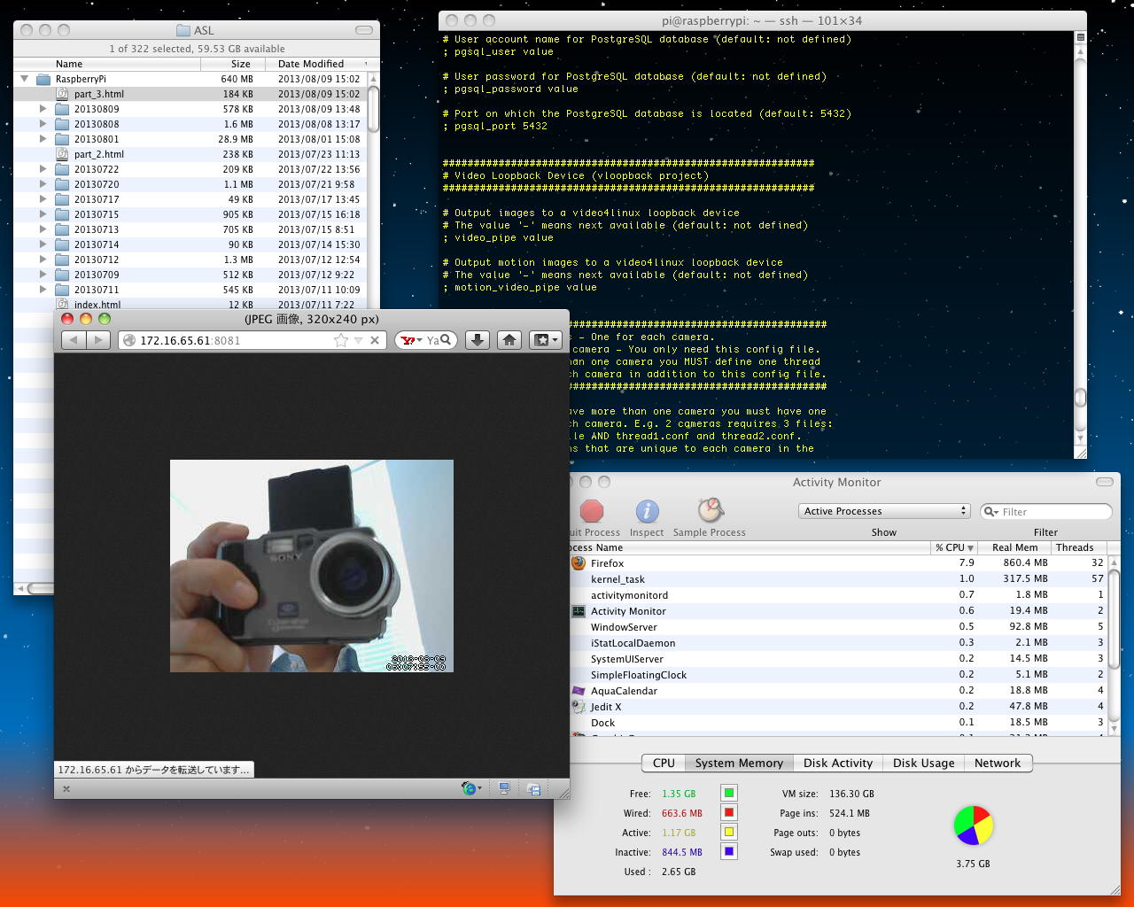 世間ではぼちぼち「お盆」である。 「しゃみーず」の撮影は8/15に延期となり、41虎の4人は「瞑想空間」で撮影の実験をしていて僕は1106にただ一人、まさにRaspberry Pi日和である。 ふーみん本の懸案のうち、どうも「Raspberry PiでWebカメラ」のパートはそこそこコンパクトに完結しているようなので、今日はここからやってみよう。 3段重ねのRaspberry Pi61/62/63号機にはBlink(1)も挿さっていて、500mAも必要なWebカメラとの共存は電源が苦しいので、ここは61/62/63号機のSDカードをそれぞれ抜いて、単体のRaspberry Piで動作させつつインストールする事にした。 現在のSDカードイメージは「0712_IP61.img」・「0712_IP62.img」・「0712_IP63.img」という3本であるが、これは16GBのSDカードにまとめてバックアップしてあるので、万一、何かトラブっても戻って来ることが出来る。この段取りの記録の場所は、Sketching2013から帰国のフライト中に過去記録を整理した「2013年7月23日(火)」のメモには無かった(^_^;)が、遠い記憶を探って「2013年6月1日(土)」と思い出した。 「apt-get」ということはモバイルWiFiルータを使うので、まずはLANからsshして固定IPをDHCPに書き換えて、あとは例の使いにくいキーボードとディスプレイを繋いで・・・という事になる。 そして、これも同じ「2013年6月1日(土)」に書かれているのを無事に思い出した。 また、「apt-get」に関する「sudo apt-get clean」・「sudo apt-get update」・「sudo apt-get upgrade」というおまじないも、「2013年5月31日(金)」にちゃんと書かれていた。