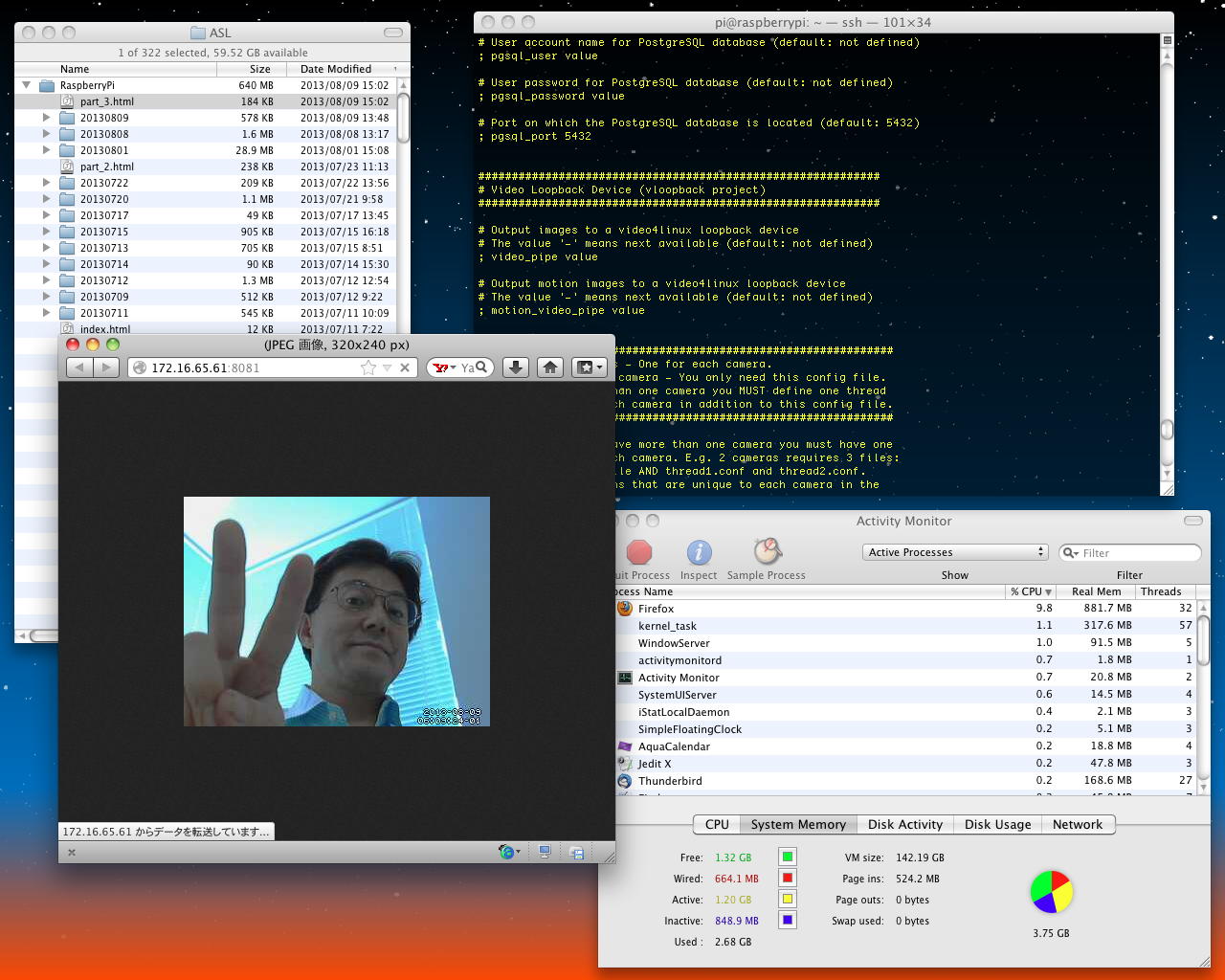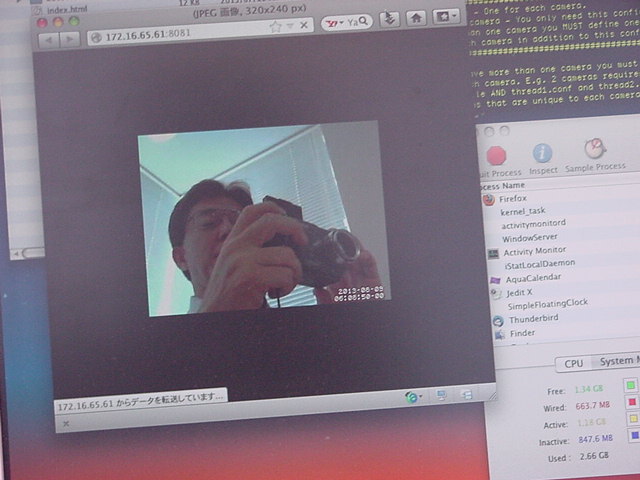 デフォルトでデーモンモードをONにしたが、ここでの起動はノンデーモンモードなので、「sudo motion -n」である。 さすがに色々と起動しているが、以下のいちばん最後の「Started stream webcam server in port 8081」で、ポート8081でのストリーミングが始まった事がわかる。pi@raspberrypi ~ $ sudo cat /etc/motion/motion.conf # Rename this distribution example file to motion.conf # # This config file was generated by motion 3.2.12 ############################################################ # Daemon ############################################################ # Start in daemon (background) mode and release terminal (default: off) daemon on # File to store the process ID, also called pid file. (default: not defined) process_id_file /var/run/motion/motion.pid ############################################################ # Basic Setup Mode ############################################################ # Start in Setup-Mode, daemon disabled. (default: off) setup_mode off ########################################################### # Capture device options ############################################################ # Videodevice to be used for capturing (default /dev/video0) # for FreeBSD default is /dev/bktr0 videodevice /dev/video0 # v4l2_palette allows to choose preferable palette to be use by motion # to capture from those supported by your videodevice. (default: 8) # E.g. if your videodevice supports both V4L2_PIX_FMT_SBGGR8 and # V4L2_PIX_FMT_MJPEG then motion will by default use V4L2_PIX_FMT_MJPEG. # Setting v4l2_palette to 1 forces motion to use V4L2_PIX_FMT_SBGGR8 # instead. # # Values : # V4L2_PIX_FMT_SN9C10X : 0 'S910' # V4L2_PIX_FMT_SBGGR8 : 1 'BA81' # V4L2_PIX_FMT_MJPEG : 2 'MJPEG' # V4L2_PIX_FMT_JPEG : 3 'JPEG' # V4L2_PIX_FMT_RGB24 : 4 'RGB3' # V4L2_PIX_FMT_UYVY : 5 'UYVY' # V4L2_PIX_FMT_YUYV : 6 'YUYV' # V4L2_PIX_FMT_YUV422P : 7 '422P' # V4L2_PIX_FMT_YUV420 : 8 'YU12' v4l2_palette 8 # Tuner device to be used for capturing using tuner as source (default /dev/tuner0) # This is ONLY used for FreeBSD. Leave it commented out for Linux ; tunerdevice /dev/tuner0 # The video input to be used (default: 8) # Should normally be set to 0 or 1 for video/TV cards, and 8 for USB cameras input 8 # The video norm to use (only for video capture and TV tuner cards) # Values: 0 (PAL), 1 (NTSC), 2 (SECAM), 3 (PAL NC no colour). Default: 0 (PAL) norm 0 # The frequency to set the tuner to (kHz) (only for TV tuner cards) (default: 0) frequency 0 # Rotate image this number of degrees. The rotation affects all saved images as # well as mpeg movies. Valid values: 0 (default = no rotation), 90, 180 and 270. rotate 0 # Image width (pixels). Valid range: Camera dependent, default: 352 width 320 # Image height (pixels). Valid range: Camera dependent, default: 288 height 240 # Maximum number of frames to be captured per second. # Valid range: 2-100. Default: 100 (almost no limit). framerate 2 # Minimum time in seconds between capturing picture frames from the camera. # Default: 0 = disabled - the capture rate is given by the camera framerate. # This option is used when you want to capture images at a rate lower than 2 per second. minimum_frame_time 0 # URL to use if you are using a network camera, size will be autodetected (incl http:// ftp:// or file:///) # Must be a URL that returns single jpeg pictures or a raw mjpeg stream. Default: Not defined ; netcam_url value # Username and password for network camera (only if required). Default: not defined # Syntax is user:password ; netcam_userpass value # The setting for keep-alive of network socket, should improve performance on compatible net cameras. # 1.0: The historical implementation using HTTP/1.0, closing the socket after each http request. # keep_alive: Use HTTP/1.0 requests with keep alive header to reuse the same connection. # 1.1: Use HTTP/1.1 requests that support keep alive as default. # Default: 1.0 ; netcam_http 1.0 # URL to use for a netcam proxy server, if required, e.g. "http://myproxy". # If a port number other than 80 is needed, use "http://myproxy:1234". # Default: not defined ; netcam_proxy value # Set less strict jpeg checks for network cameras with a poor/buggy firmware. # Default: off netcam_tolerant_check off # Let motion regulate the brightness of a video device (default: off). # The auto_brightness feature uses the brightness option as its target value. # If brightness is zero auto_brightness will adjust to average brightness value 128. # Only recommended for cameras without auto brightness auto_brightness off # Set the initial brightness of a video device. # If auto_brightness is enabled, this value defines the average brightness level # which Motion will try and adjust to. # Valid range 0-255, default 0 = disabled brightness 0 # Set the contrast of a video device. # Valid range 0-255, default 0 = disabled contrast 0 # Set the saturation of a video device. # Valid range 0-255, default 0 = disabled saturation 0 # Set the hue of a video device (NTSC feature). # Valid range 0-255, default 0 = disabled hue 0 ############################################################ # Round Robin (multiple inputs on same video device name) ############################################################ # Number of frames to capture in each roundrobin step (default: 1) roundrobin_frames 1 # Number of frames to skip before each roundrobin step (default: 1) roundrobin_skip 1 # Try to filter out noise generated by roundrobin (default: off) switchfilter off ############################################################ # Motion Detection Settings: ############################################################ # Threshold for number of changed pixels in an image that # triggers motion detection (default: 1500) threshold 1500 # Automatically tune the threshold down if possible (default: off) threshold_tune off # Noise threshold for the motion detection (default: 32) noise_level 32 # Automatical