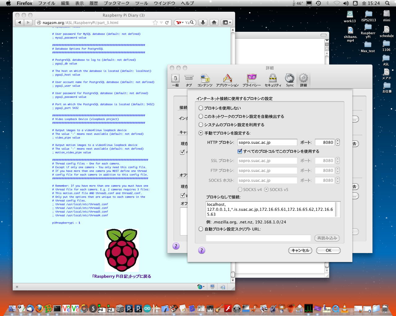 そこでまず、単体のRaspberry Piに61号機のSDカードを入れて、上のように研究室LANに繋いで立ち上げ、Macからsshして「sudo nano /etc/network/interfaces」で、固定IPをコメントアウトしてDHCPに設定変更し、保存して「sudo halt」した。 その後、モバイルWiFiルータを起動して、MacBookAirを接続してSUACネット(プロキシ)でなく直接のネット接続を指定すると、お約束の「1day = 600円」の契約画面が出て、クレジット支払いをOKとして無事に稼働したのを確認すると、今度は以下のように、Raspberry Piにモニタとキーボードとマウスを繋ぎ、LANをモバイルWiFiルータのクレードルに接続して立ち上げた。 Webカメラの電流が500mAということで、ACアダプタタイプのUSBハブを経由してキーボードとマウスとWebカメラを繋ぐと、まだソフトウェアはインストールしていないものの、ドライパはちゃんとこのロジテックのC270というWebカメラを「Devic 010」として認識してくれた(^_^)。