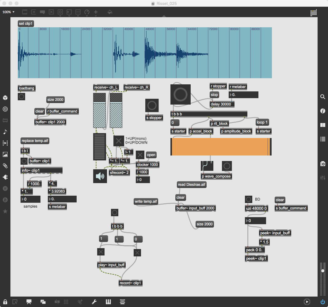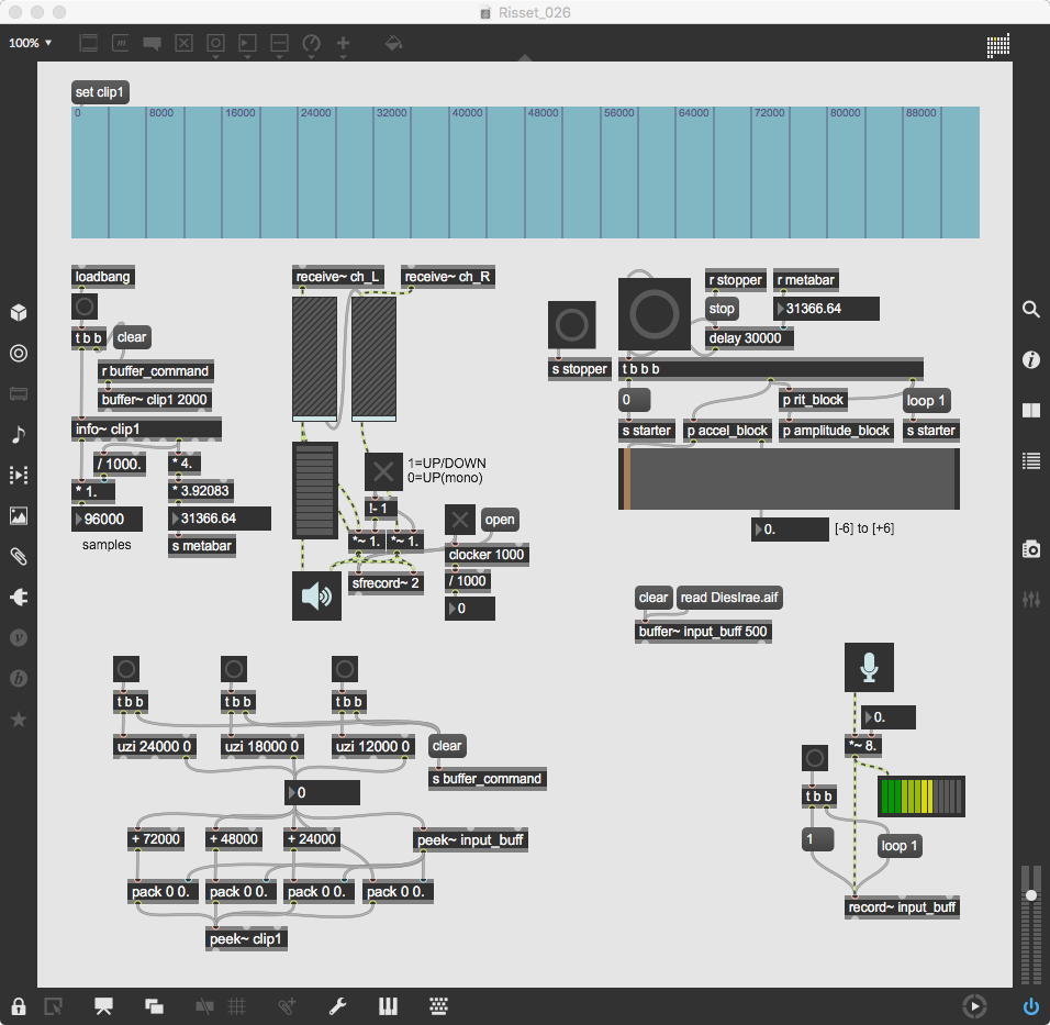 実装においては、サンプリング開始と同時に「clocker」でサンブリング終了までの時間を計測し★、サンプリング音響をいったんtemporaryサウンドファイルに書き出し、Risset Rhythm化バッファメモリをこの★計測時間でリサイズしたところにtemporaryサウンドファイルから読み込むことで、その冒頭の有効部分だけがきっちりとRisset Rhythm化できるようにした、というシンプルなロジックを用いた。 この手法は従来から行ってきたライヴComputer Musicにおいても有効に活用できる、という意味でも大きな収穫である。 サンプリングのためのインターフェースとして、従来型の「スタート・トリガ」専用のスイッチでは役に立たず、「ON」と「OFF」の両方を検出する必要があるが、これは筆者にとってはお茶の子さいさいで全く問題がない。