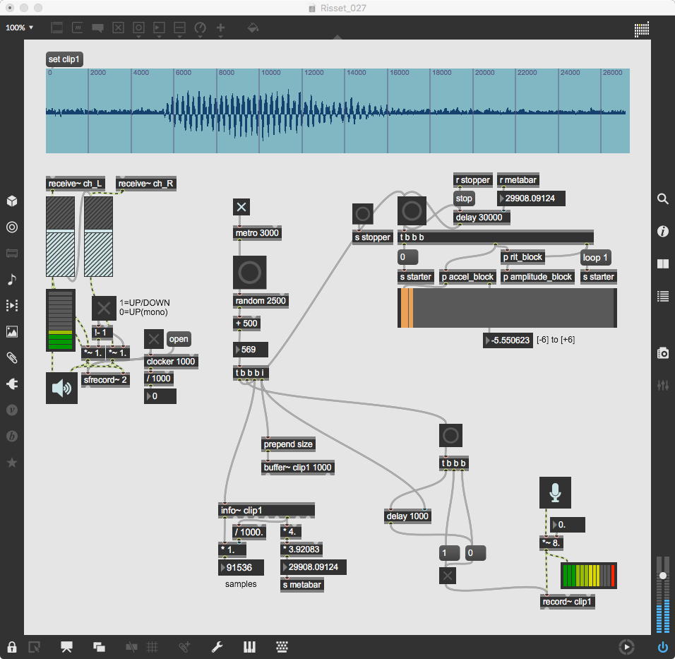 上のMaxパッチ「Risset_027.maxpat」は、それならば刻々とどんどんサンプリングしてしまおう・・・と実験したものであるが、結論から言えば失敗であった。 このパッチでは中央の「metro 3000」オブジェクトによって、時間幅はランダムに変化するものの、刻々と連続してRisset Rhythm化するための波形メモリにライヴサウンドをサンプリングしようとしたが、これだと多数のブロックでスピードを変化しつつ再生するという肝心のRisset Rhythm化の再生(生成)処理をする前に、その肝心の波形データが次のデータに書き換えられてしまうので、まったく機能しない。 中央の「metro 3000」オブジェクトを消して、その次にある「bang」ボタンをクリックするだけであれば、そのサンプルが刻々とRisset Rhythm化されるものの、ここでもやや行き詰まってしまった。