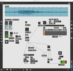上のMaxパッチ「Risset_026.maxpat」は、とりあえずRisset Rhythm化するための波形メモリは一定サイズに固定しつつ、ライヴ・サンプリングした波形から「peek~」を使って一部をライヴに書き換える・・・というような実験の模様である。 しかしこの方法は、サウンド素材としてドラム音でなくサンプル音を使用するとしても、第13章の「Real Time Risset Rhythm Generator」とほとんど変わらない印象があり、せっかくのRisset Rhythmを「面白いサウンド→面白い音楽」に発展させるためのplatformに・・・という目的にはまったく不足するという印象となった。