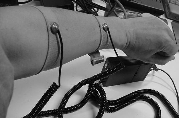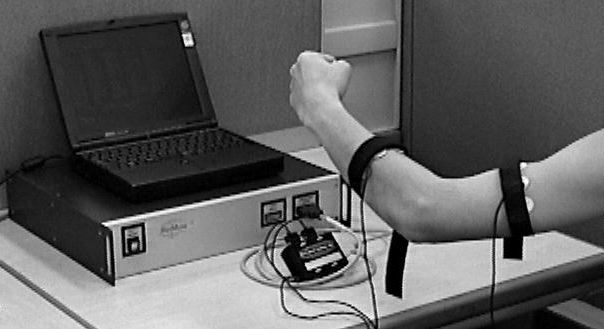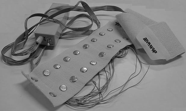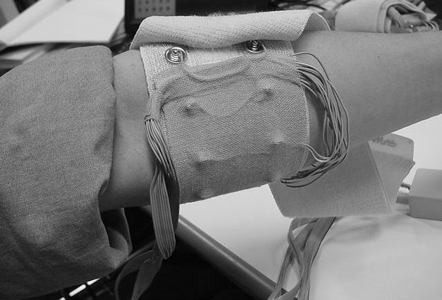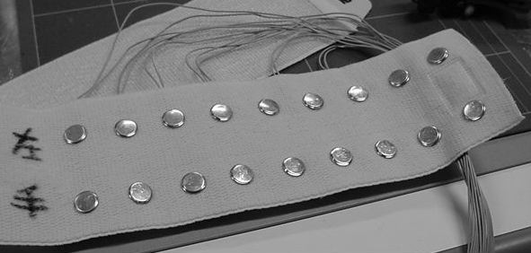 図3 BioMuseを用いた演奏風景(Atau Tanaka) (c) Peter Kers, the photographer このBioMuseは市販の製品であるが、センサの銀-塩化銀電極を導電ジェルによって取り付ける手間、その電極の寿命と交換の手間、システムとしての大きさと重さ、そして何より高価である(約3万ドル)ことなど、活用しているAtau Tanaka氏自身がいくつもの課題を指摘するものだった(図4)。もともと音楽用途というよりも、身体障害者のための意志伝達手段や、脳波・眼球筋肉運動などの検出にも利用できる汎用生体センサであるため、医用機器としての信頼性やコスト要求からして当然であるとも言える。 図4 BioMuse