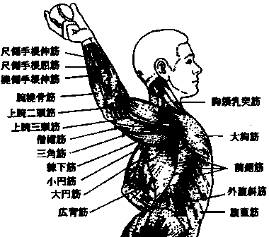 1. はじめにコンピュータ音楽を中心としたメディア・アート、システムと人間とのインターフェース等に関するテーマの研究活動とともに、その具体的な応用を実験的に検証する意味で、実際にいろいろなインタラクティブ・マルチメディア作品を創作して公演・発表する活動を行っている(1-9)。オリジナルセンサを用いた実験的なシステムをリアルタイムパフォーマンスに応用することで、開発の過程や作品・公演の中から新たな研究テーマや課題が出てくることも多い。本稿ではその一つのサブテーマであるオリジナルセンサの研究開発に関して、新しく開発した筋電センサ "MiniBioMuse-III" について報告する。図1 上半身の筋肉のいろいろ