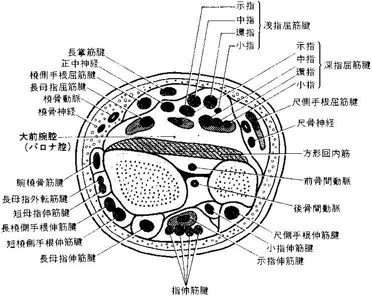 2. 腕の筋電情報のセンシング人間の随意運動のセンシング対象としては、歴史的に「手」「腕」(図1、図2)が重視されており、文献においても「腕の筋電情報」を取り上げたものは多い(10-23)。図2 前腕遠位の横断面 筋電センサを活用したコンピュータ音楽やインターフェースに関するテーマでは、IRCAM / CCRMAのAtau TanakaによるBioMuseを利用したヒューマンインターフェースの研究と音楽パフォーマンス活動(sensorband)が国際的によく知られている(24-26)。ここでは、両腕の異なる2個所ずつに筋電センサを取り付け、伝統的な楽器と変わらない修練と習熟により、身体表現としての演奏情報をリアルタイム音響合成パラメータに適用した演奏などを行っている(図3)。