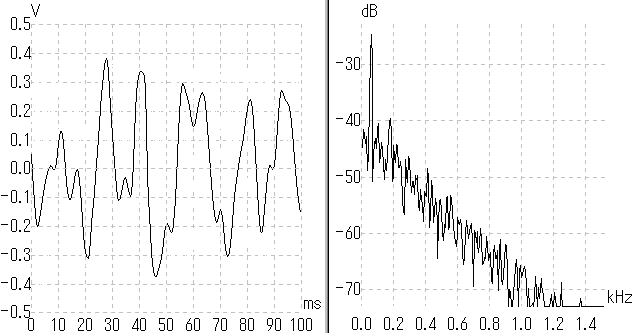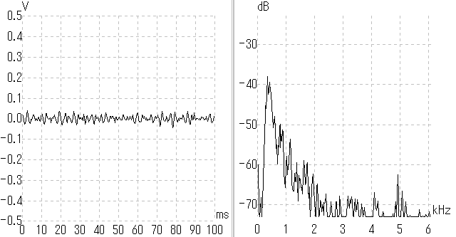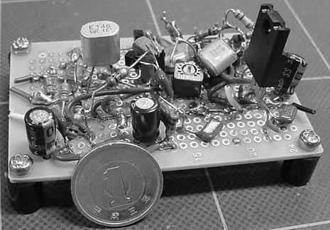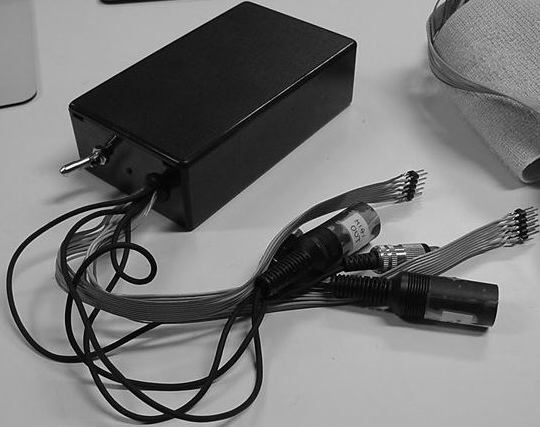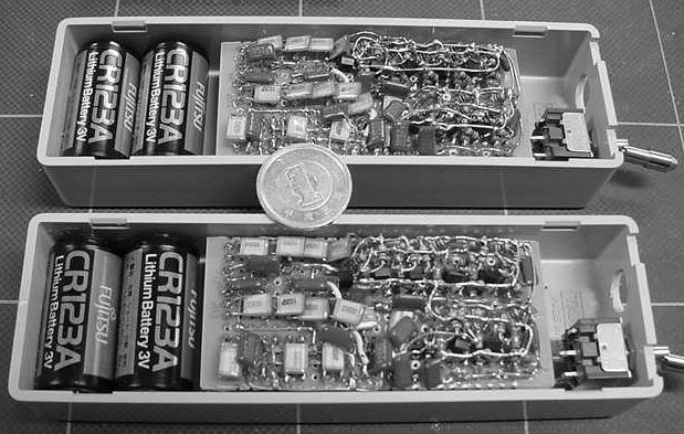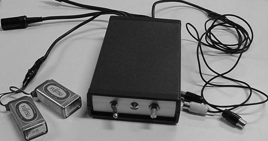 図7 MiniBioMuse-Iの緊張時出力の例 ビデオテープ程のサイズながら筋電ノイズそのものをアナログ出力しつつ同時にA/D変換してMIDI出力する、という機能には、Atau Tanaka氏も良好な評価を与えた(後継機に期待表明)。図6は筋肉を弛緩させた時の、図7は筋肉を緊張させた時の"MiniBioMuse-I"のアナログ出力信号(左側がオシロ、右側がスペアナ)である。ハムを中心とした残留ノイズが見て取れる。 3-3. " MiniBioMuse-II "図8 MiniBioMuse-II 図8は、"MiniBioMuse-I"から新たな改良により開発した"MiniBioMuse-II"である。電子回路的には、ノイズの点で限界のあるOPアンプによるフロントエンド回路から、図9のような、高感度デュアルFETを用いたディスクリート・トランジスタ回路へと発展した。これは、特性の揃った2つのFETを金属ケースで熱結合した特殊なFETである2SK146により、単一電源で良好な高倍率差動増幅回路を実現したものであり、小型ケースに2チャンネル*2電極とコモン電極の全ての回路を格納した。アナログ電圧出力はケーブルで延長したサブボックスでMIDI化するように分離した結果、照明などノイズ環境の劣悪なステージでのライブパフォーマンス(京都と神戸で公演)にも使用できる、という実績を得た。