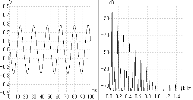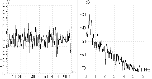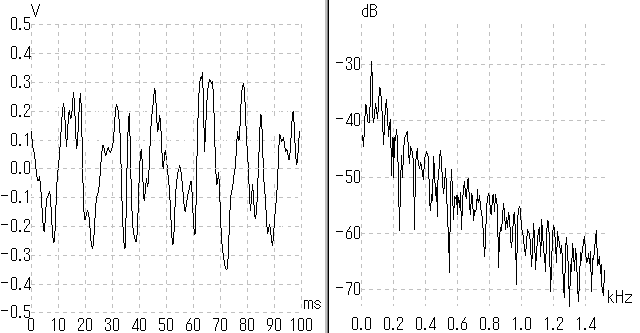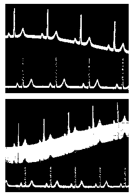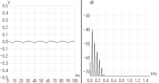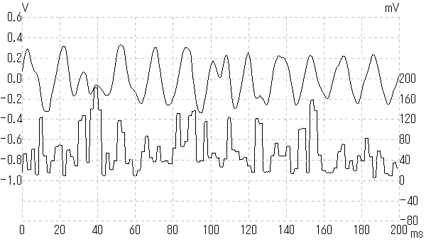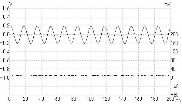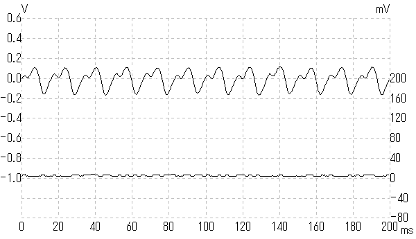 図22 MiniBioMuse-IIIの装着風景 図21は、完成した"MiniBioMuse-III"の片腕8チャンネル部分の電極からセンシングボックスまで、図22はこの電極を装着した様子である。介護用ベルトは伸縮自在で無理なく密着固定でき、軽快なリボンケーブルとともに使用感は良好である。メインインターフェースボックスとの接続は図19に見えるフラットケーブルコネクタにより行う(向きが異なり混同しない)。 5-1. アナログセンシング出力信号図23 MiniBioMuse-IIIの平静時出力の例 図23は、"MiniBioMuse-III"の両腕16チャンネルのフロントエンド回路からの出力を同一条件で計測した平静時信号のうち、もっともハムノイズの大きなチャンネル(上段)と小さなチャンネル(下段)の様子である(全てのデータは文献(32)を参照のこと)。これは位置関係の異なるアース電極を共通とし、また腕の筋肉の配置の様子によりばらつきが出るのは、ある意味で当然のこととして吸収しなければならない。 図24 MiniBioMuse-IIIの緊張時出力の例 図24は緊張時信号の一例であり、ハム成分が乗っているものの、明らかに筋電信号がある。この図23/24の信号は、図6/7の初代よりも劣るように見えるかもしれないが、電源電圧が1/3であるにもかかわらず、後段でのノイズフィルタリング前にここまでの信号が安定に得られるというのは画期的進展なのである。 5-2. ディジタルフィルタリング出力信号フロントエンド回路部分のOPアンプによるフィルタ以外に"MiniBioMuse-III"がソフトウェア的に行っているのは、図12のディジタルフィルタのアルゴリズムの一部を利用した積分フィルタリングと、MIDI出力のためにダウンサンプリングを重ねて時間平均(平滑化)を行っている部分である。ここではまず、前者について実際の計測データを用いて紹介する。 図25は、上段が"MiniBioMuse-III"の16チャンネルのうちのあるチャンネルのフロントエンド平静時信号である。ハム成分のシンプルな正弦波であり、これをそのまま音源素材として使用することは困難である。ところがこの図の下段では、ほとんど信号が消えている。これはAKI-H8によるソフトウェア・フィルタリングの出力を増設したD/Aポートから出力したそのままの信号であり、アンチエイリアシング回路の前段ということでディジタル的に変化しているものの、特性としてハムに対応した周期の信号がキャンセルされていることがわかる。図25 MiniBioMuse-IIIの平静時出力の例(1)