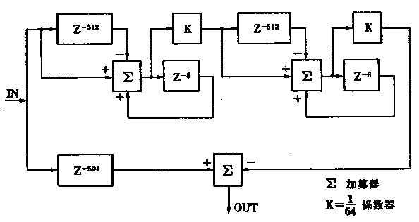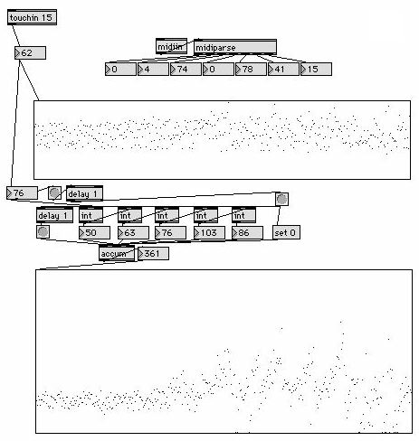 図10 MiniBioMuse-IIの出力の一例 図10は、"MiniBioMuse-II"からのMIDI情報を実際の音楽において利用するためのMaxパッチによる処理の一例である。上段のグラフはセンサからの直接の情報をそのままプロットしたものであり、下段ではこれを移動平均する処理により、右側で筋肉が緊張状態になった波動が明確に得られているのが分かる。 図図11 MiniBioMuse-IIを用いた演奏風景 図11は、筆者の作品"Bio-Cosmic Storm"の京都での公演(1998年)の風景である。ステージ上のピアニストは両腕に"MiniBioMuse-II"のセンサを取り付け、そこから直接出力される筋電ノイズを音源としてSuperColliderでリアルタイム音響信号処理するシステムをコントロールするMaxのためのMIDI情報も同時に演奏出力した。ピアニストはステージ上のピアノの鍵盤に触れてはいけない、という指示のもと、鍵盤上空5cmでピアノ曲をシャドー演奏したりピアノそのものを押したりして、その筋電情報によりリアルタイムCGとともに楽音を生成した。 4. " MiniBioMuse-III "の開発前作"MiniBioMuse-II"からその後の進展は1年以上、停滞した。その理由は、図9にある改良された筋電センサ・フロントエンド回路によっても完全にはハムが取れないこと、そしてかなりの小型化によって作品公演まで実現したことで、それ以上の大きな性能向上の具体的な目標が見えなかったことによる。それが2000年から 2001年にかけて急速に進展し、最終的に新しい"MiniBioMuse-III"として一気に結実した。以下、その過程と概要について紹介する。4-1. 独立成分分析による多チャンネル計測BioMuseのように腕に単一ないし2つの電極を用いるのでなく、腕をぐるりと巻くように多数の電極を用いて同時計測し、複数の筋肉の作用をパターン認識の一手法である独立成分分析により検出する、という藤原の研究(30)と交流・情報交換する機会を得た。Atau Tanakaは電極の位置について独自のトレーニングにより(非対称な)適正設置場所を獲得したが、この研究によれば、ベルト状の複数電極により情報検出とパターン認識の汎用性が得られる可能性があった。4-2. ソフトウェアDSPによるノッチフィルタステージなど劣悪なノイズ環境で筋電センサを使用する上でもっとも問題となるハムノイズの除去手法として、古くから知られたノッチフィルタをA/Dセンシングのマイクロプロセッサのソフトウェアで実現する、という可能性を実験する段階が到来した。具体的には、文献(31)にある図12のようなアルゴリズムを、AKI-H8のCPUプログラムとして実装する実験を行った。図12 ノッチフィルタのアルゴリズム例 後述する"MiniBioMuse-III"の開発の過程で図12のアルゴリズムをAKI-H8に実装した結果、図13のような特性で50Hz/60Hzのハム成分をカットする筈であったフィルタ出力は、実際には目に見える(耳に聞こえる)違いを見出せないという結果であった。その理由は、(1) AKI-H8のアナログ入力A/Dを8ビット精度モードとして動作させた、(2) AKI-H8の内蔵RAMの容量からくる制限により、ディジタルフィルタのビット幅として16ビット精度の確保が困難なため8ビット幅とした、という点にある。これにより、ビットシフト演算によって計算途中のデータが丸められて実質的には消滅してしまった。そこで折衷案として、8ビット幅の処理でも有効となる図12のアルゴリズムの一部をAKI-H8のソフトウェアとして実装して、何もない状態よりは有意に有効なソフトウェア・フィルタリング(一種の積分型フィルタ)を実現することができた。 図13 ノッチフィルタ(上段:入力 / 下段:出力)