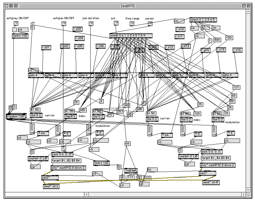 4-5. Suguru Goto氏によるFM合成図9は、音源のメインとなったFM方式による音響生成ブロックのサブパッチである。この作曲期間である2001年8月に、 筆者はIAMASが開催するDSPSSに参加し、IRCAMで活動しているSuguru Goto氏と再会した(Goto氏はパリでの筆者の CCMIXワークショップにも来訪した)。Goto氏は従来から、センサを活用した作品とそのパフォーマンスにおいて、 ISPW / jMax / MSPなどを活用してFM方式の音響生成に手慣れた作曲家であり、このDSPSS2001の機会に、講師と してGoto氏が提供したMSP4のためのFMサンプルパッチをさっそく材料として活用したのがこのブロックである。 Max/MSPのパッチはオープンソースの発想で世界中に提供されている、その文化の恩恵を受けた形となった。なお、 比較的少数のオペレータでも面白いサウンドを生成できるFM方式であるが、音の分厚さを求めてオペレータを多数に していくと、DSP稼働率が上がって不安定な状態となったため、最終的にはトライ&エラーで現実解を捜した。あくまで 体感であるが、ピーク時でも33%程度が上限となる目安でチューニングした。図9 FM合成の部分