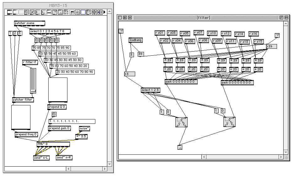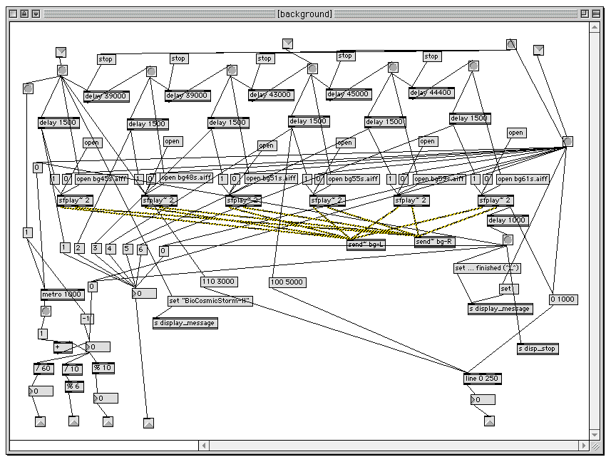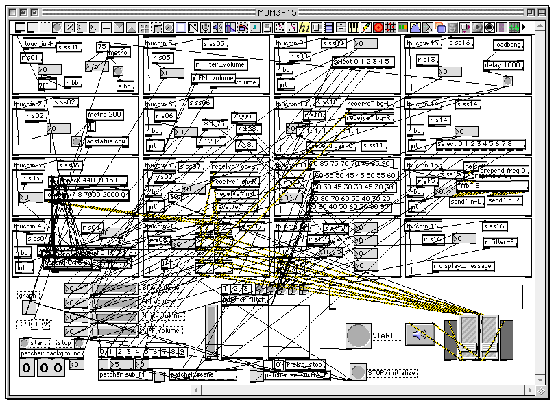 3. "MiniBioMuse-III"のセンシング情報図2は、"MiniBioMuse-III"の両腕16チャンネルのセンシング情報をリアルタイムに表示するMaxパッチの画面である。 中核にあるマイコンAKI-H8の処理能力としては十分に高速なデータ収集が可能であるが、実際にはMIDI情報を受信する Maxの側でのトラブルに悩まされた。図2 MiniBioMuse-IIIのMIDI出力情報の例 図2は、Max3.6.2の走るPowerBook2400/G3 (320MHz)の画面のスクリーンショットであるが、このMacはシリアルポート経由 のMIDIインターフェースであるために、10msec間隔で16channelsを連続受信して、さらにこの画面を外部ディスプレイにミラー リング出力しても何も問題が起きなかった。ところが、まったく同じこのMaxパッチを、PowerBookG3(400MHz)で走らせ、 スクリーンをミラーリング出力したところ、ほぼ確実に深刻なフリーズが頻発して使えない、という現象に遭遇した。最大の原因は MIDIインターフェースがUSB経由となったためと思われ、OMSが十分にUSB対応できていないらしく、この段階でライブでの使用には 大きな不安となった。その後、主にMSPの信号処理関係が充実してMSP1.0からMSP2.0となった新しいMax4/MSP2(19)がリリース されたが、どうやらMIDI周辺は今後はUSBでいくしかない、という気合いの入った改良が行われたらしく、一挙に状況は改善された。 それまではQuickTimeのGM音源でも不安だったMIDI処理が非常に軽快になり、図2のようなライブグラフィクスとともに音源部分を MSPのソフトウェアシンセシスとした状態でも、iBook(500MHz)とUSBインターフェースで安定して動作することが確認できた。 この状況を受けて、欧州公演では初めて、MSP音源による作品のライブ演奏を決意した。それまではKymaやSuperColliderをMaxの MIDIで制御する、と限定してきただけに、筆者としてはやや勇気ある挑戦となった。これは、多数のMIDI音源等に対してMaxやシーケンサ 等から「MIDI出力」する分にはUSB-MIDIであってもまったく問題がない(暇な時に処理するので多忙ならモタりつつ遅れてMIDI送信する だけ)のに対して、多量のセンサ情報をライブで確実に受信するインタラクティブアートの宿命である。 4. "BioCosmicStorm-II"のメイキング図3は作品"BioCosmicStorm-II"のメインパッチの実行モード画面、図4はその編集モード画面である。作品の公演においては、 このiBookの画面ミラーリング出力をステージ後方の大型スクリーンにプロジェクションして、筋電情報が ライブに検出され、そこからリアルタイム楽音合成のパラメータとして音響に作用していることを作品のコンセプトとして明確に表現した。 センサ等を用いたインタラクティブパフォーマンスにおいては、「センサ技術のデモではない」という視点から、このように明確な 関係性を敢えて提示しないことも少なくないが、聴衆はせっかくのライブPerformerの動きとサウンドやグラフィクスとのリアル タイム連係に気付かず、ビデオやCDを「再生」して、それに合わせて何か動いている、と悲しい誤解をされることも多かった。 この点で、今回の作品公演では少なくとも「見えた」聴衆にはなかなか好評であった点が一つの収穫であったと思う。図3 作品"BioCosmicStorm-II"のメインパッチ 図4 作品"BioCosmicStorm-II"のメインパッチ(編集モード画面)