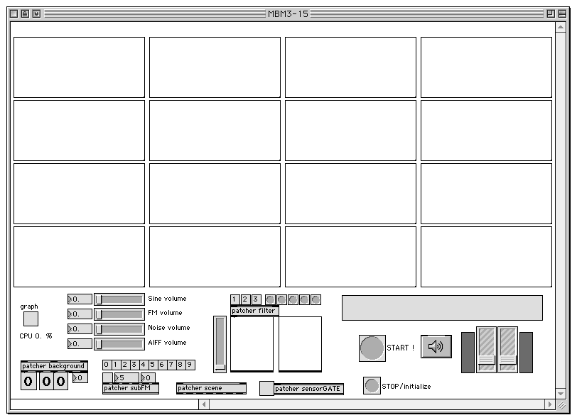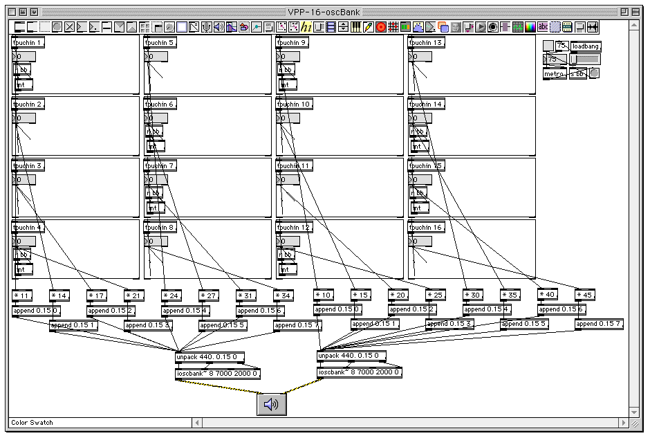 4-3. 背景音響パートの再生図7は、作品全体の背景音響として流れるパートの「再生」サブパッチである。音響素材はあらかじめIndyとKyma等を 用いて作曲した。この作品ではほぼ演奏時間は一定であるが、BGMパートをCDに固定して再生するのはポリシーに反する こと、7分近い1本のサウンドファイルを再生することへの心配、オーバーラップ再生して重ねる部分にある程度の自由度を 持ちたかったこと、等の理由で、約1分の長さに分割して順番にオープンしてはplayする方式とした。図7 背景音響パートの生成部分 なお、2002年1月に東京都写真美術館で発表したインスタレーション作品では、逆に20分ほどの長大な背景サウンドパートを CD化してMSPでエンドレス再生し、その音量をコマ切れに絞って複数のサウンド生成を行った。新しいバージョンのMSPでは、 いずれも容易である。 4-4. オシレータバンクによるサイン合成図8は、センサからの16チャンネルのそれぞれに対応したサイン波ジェネレータによる、サイン合成ブロックの実験風景である。 ここからはいよいよ音源そのものとしての信号処理となるために、常にDSP稼働率を表示・監視して、過重な処理によるシステム ダウンを警戒した。最終的には、このブロックは多数のオシレータバンクのピッチ情報としてセンサ出力をそのままマッピングする だけで、イメージ通りの混然とした音響を得ることができた。図8 サイン合成の部分