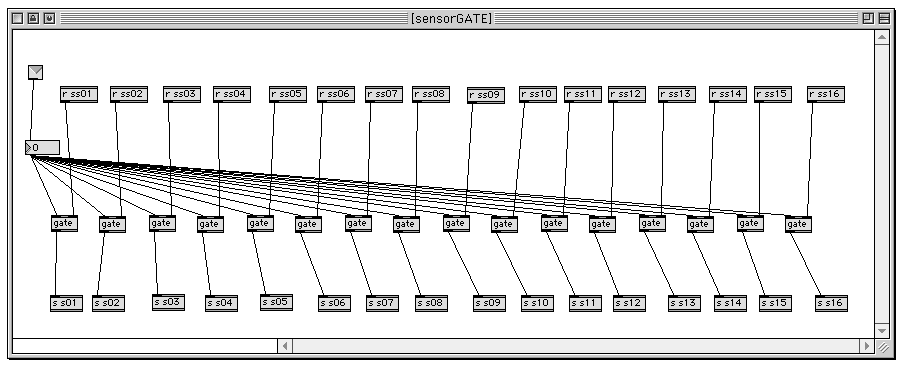 4-1. センサ情報のgating図5は、センサからMaxに入力されたMIDI情報をまずゲートする関門である。これ無しでは心配で何もできない、定番ノウハウである。図5 センサ情報のゲート群