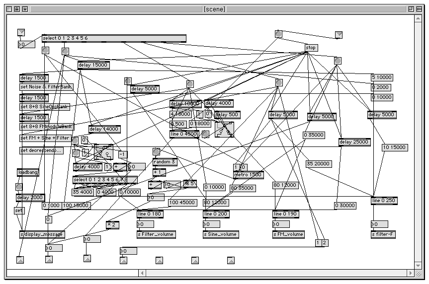 4-2. シーン移行の管理図6は、スタートから時間的に全体のシーンが推移していく流れを管理する、一種の柔軟なシーケンサのようサブパッチである。 この作品では作曲者本人がperformanceを行ったので、シーンの推移について伝達する苦労は不要であった。画面の片隅には、 シーンの推移と同期して、テキスト表示で「現在はFM音源アルゴリズムの音です」というような内幕暴露サービスを行って みたが、これは賛否両論であった。図6 シーン移行の管理部分