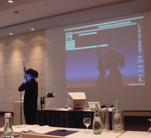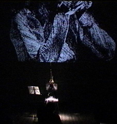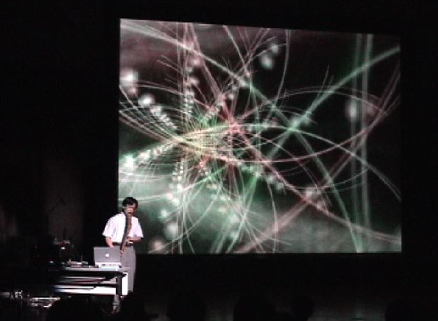 "Japanesque Germanium"の公演風景(Kassel, Germany)渡欧ツアーの翌2002年に筆者は再びMAF2002[24]をプロデュースして、ライヴComputer Musicコンサートとして2夜連続で「由雄正恒・中村文隆・岡本久・平野砂峰旅・長嶋洋一」・「佐近田展康・赤松正行・三輪眞弘・東野珠実・後藤英・Joshua Kit Clayton」(敬称略・出演順)の各氏が公演した。東野さんは2002ver.の作品"I/O"を公演し、筆者はBass Recorder(←伏線[C])を演奏してライブに音響/グラフィクスを変容させる作品"Berlin Power"[25]を初演した。