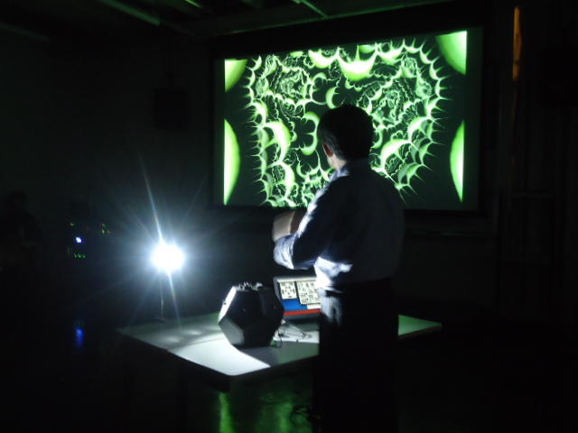 伊藤光波子氏の舞楽ただしこの6月3日の「コンサート」全般としては、冒頭に思い付いて笙の即興演奏を披露して客席を温めた東野さん[60]、小笠原清基氏の弓の実演[61]、[まり+東野+Gerard]のセッション[62]、さらに加わった伊藤光波子さんの舞楽[63]、などが次々に進んで、それほど音楽的に専門家というわけでもない満席の来場者(万博観光客)は珍しいパフォーマンスの連続に十分に満足してくれた。ステージ中央の光波子さんの舞楽の身体動作情報を「MUGIC」(←伏線[F])で取得して、まりさんのMaxパッチで生成グラフィクスをインタラクティブに変化させたのだが、ステージから横方向にかなり離れた壁面に投射したので、聴衆は舞楽とスクリーンのどちらかを見る感じになったのが残念だったものの、結果として、プロジェクトの「パート1」全体としては成功したと言える。
