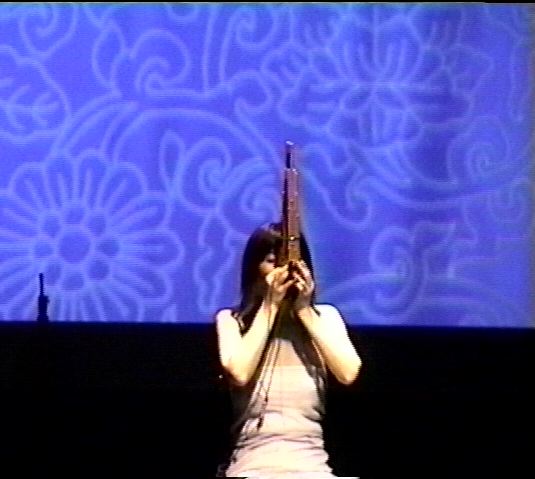 MAF2001での作品"I/O"公演(東野珠実氏)筆者は次項「渡欧ツアー」のために作曲した、13弦箏/17弦箏をライヴサンプリングして「自身の残像音響と競演する」作品"tegoto"[17]を初演した。東野さんの高崎音楽祭での凱旋公演[18]に筆者が協力したり、SUAC「瞑想空間」プロジェクト「靄夜(もや)」[19]や特別講義などに来てくれた東野さんは、MAF2001で筆者の"Visional Legend"を再演した。