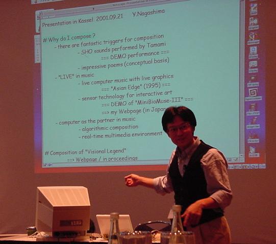 「Human Supervision and Control in Engineering and Music」で講演する筆者と東野氏ドイツでの計3回のコンサートでは、前半で三好芫山・三好晃子・東野珠実の3氏が日本伝統音楽を披露し、後半では筆者も加わって「コンピュータ+伝統楽器」の公演を行った。具体的には前半「Japanese Traditional Music」では、"Tsuru no Sugomori" (Shakuhachi solo) - composed 500 years ago、"Midare" (Koto solo) - composed 350 years ago、"Hirajyo no Choshi" (Sho solo) - Traditional Gagaku、"Ichikotsu" (Shakuhachi and Koto) - Traditional、の4曲を演奏し、後半「Expanded Traditional/Contemporary Music」では筆者の作曲である、"Bio-Cosmic Storm II" (BioSensor and live Computer)、"Visional Legend" (Sho, Graphics and live Computer)、"tegoto" (Koto and live Computer)、"Japanesque Germanium" (all 4 players)、の4曲[23]と共に、途中で大師範・三好芫山さんの尺八即興"Getsuro" (Shakuhachi solo)も演奏した。