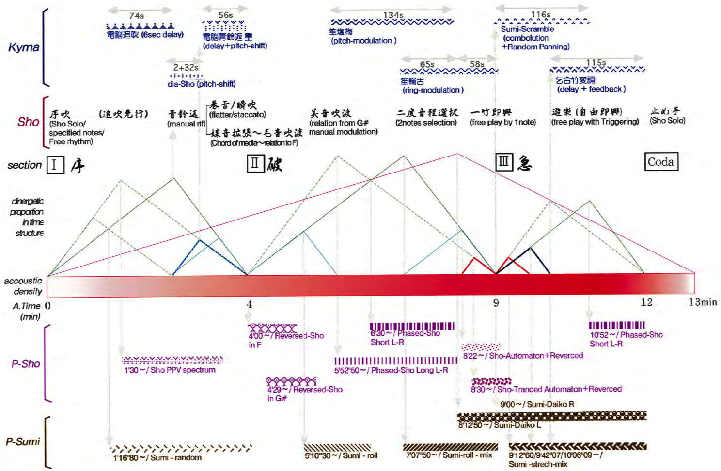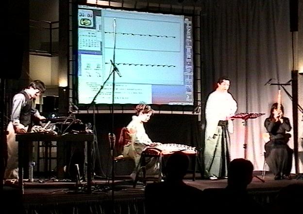 Special Lecture by Radek Rudnicki at SUAC筆者が新開発した笙ブレスセンサ[9]★★を用いて、自身の演奏する笙サウンドにKymaでライヴ音響処理を施す東野さんの作品"dinergy2"(→伏線[A])は翌年のICMC1998[ミシガン]に入選し、ここに研究発表参加していた筆者は公演のテクニカルサポートを行った[10]★。この作品は同じ月に「Kobe International Computer Music Festival」(1998)でも再演されたが、そのコンサートでは、「SFC録音「笙」音響素材」★を用いて笙ブレスセンサによりライヴ映像/音響を駆動する、という筆者の作品"Visional Legend"[11]も東野さんの演奏にて初演した。