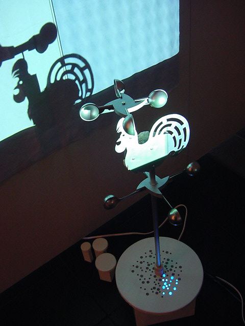 1 big windmill and 3 small windmills rotate reacting with lighting sensors. This is a live performance on the stage with the installation works.- System