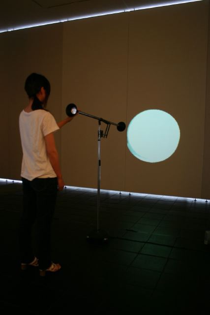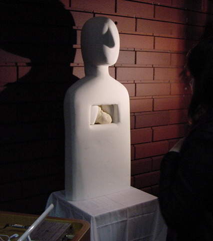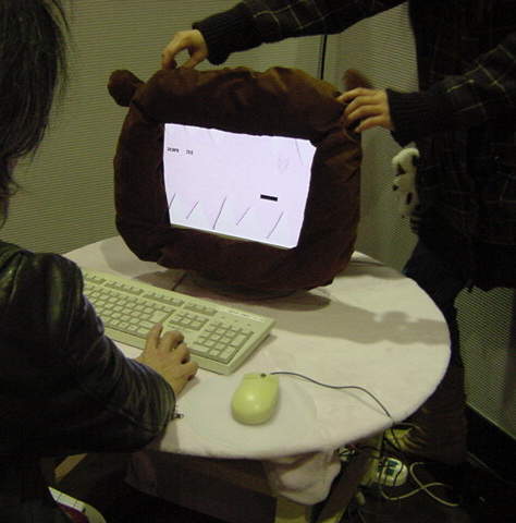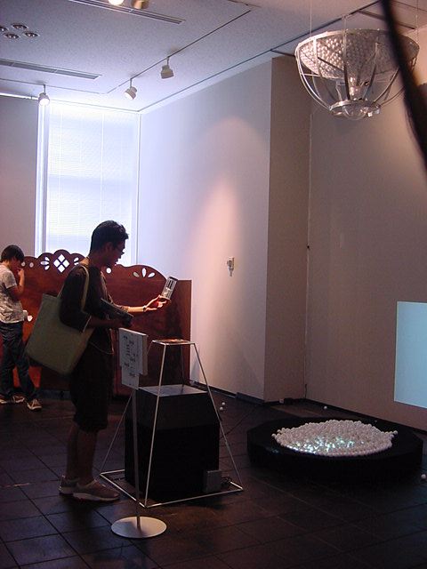 In the dark hall, a doll of pretty girl sits on the wall. Both eyes of the doll are missing. There is also a mirror on the wall. When people stands near of the doll, the mirror changes into screen which shows people himself/herself with the view from one eye-hole of the doll (inside CCD camera). There are some eye-balls in front of the wall, and when people pick up them, the screen image changes.- System