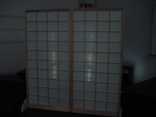 The concept of this installation work is Japanese slight vibration on the water. Japanese traditional SHOJI screen is set for projected images. The projection is not directly projected but reflected by water. The water is vibrated with low frequency sound.- System