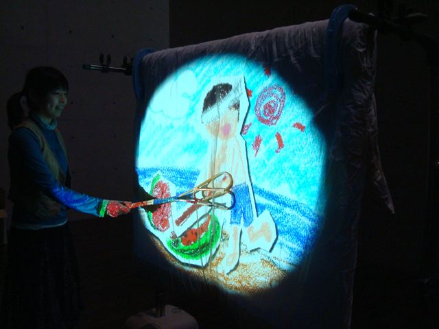 There is the Futon (Japanese blanket) on the stand and it is screen. When people beats the Futon, then images/movies of memories appear on the Futon.- System