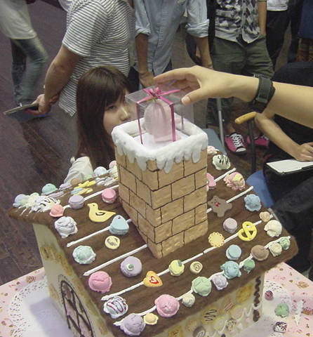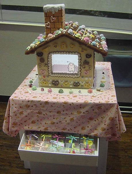 This installation work is a house made of cookies, chocolates, candies, etc. People pick up one of gifts from the table, and put it into the chimney. Then, related story movie starts in the window monitor of the house. After that, the gift is automatically moved out from the house, then another gift can be put in.- System