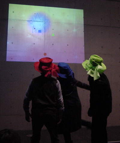 This installation work is an expansion of the work "OTOkakecco" with 4 Muose. 3 people wear 3 color hats - red, green and blue. The web-camera detects the points of each player, then they play the game.- System