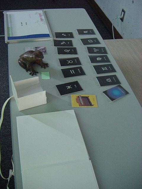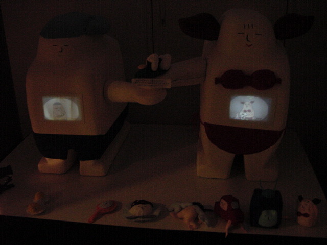 There are 2 dolls of lovers. People pick up one of objects from the table and put it onto their hands. Then, common story is displayed in the center screen, and next the "real voice" (secret) movie is displayed in each stomach part of dolls. People enjoy the difference of their "real voices".- System