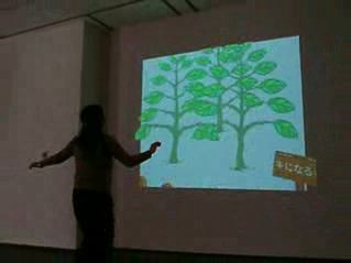 There are 4 small panels (painted on upper side - seed, small leaf, frog, and tree) on the table. People pick up and put them on the table. On the screen, there starts the special tale movie related with the sequence of these 4 panels.- System