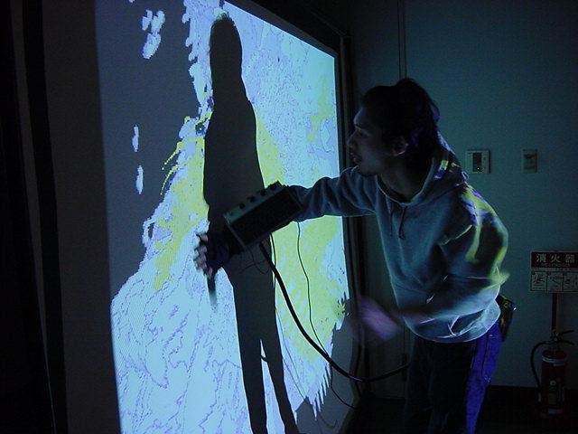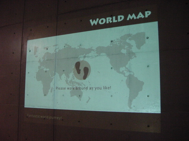 People can walk around on the big world map. When people step on some points, the movie related to the area in the world are projected on the wall screen.- System